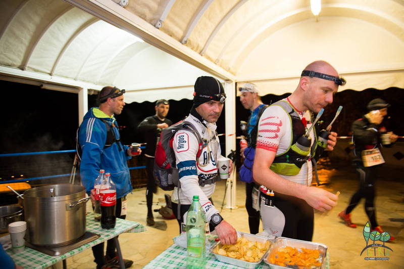 Vmes sem pojedel nekaj gelov, ki mi niso najbolj sedli in sem se potem priklopil na pravo hrano (klobase in kruh, sir in čokoladice Snickers). Na začetku sem imel 2l pšenične kave (Proja), nato pa vodo z nekaj soli in multi tabletami, dodajal sem še magnezij Diasporal …