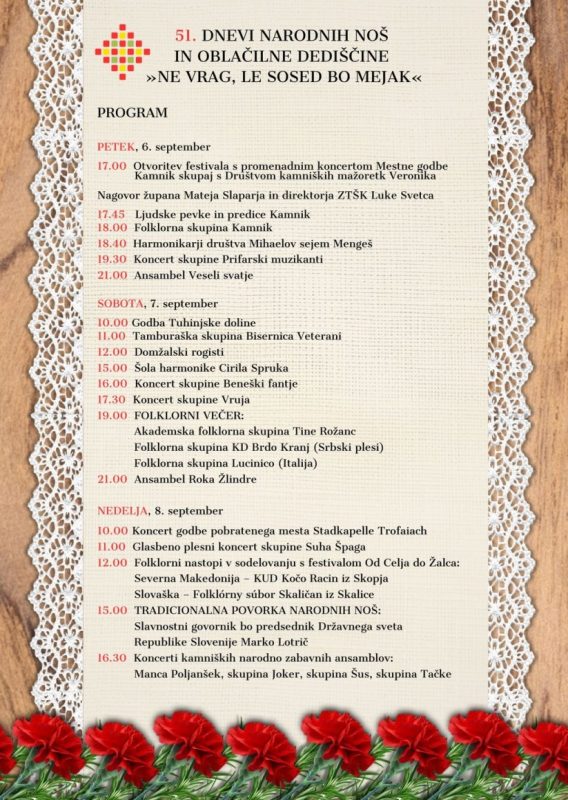 Pod geslom, povzetim iz slovenske himne, »Ne vrag, le sosed bo mejak« se letos obeta še ena izjemna izvedba Dnevov narodnih noš in oblačilne dediščine v Kamniku. Ta tradicionalni festival, ki že več kot pol stoletja privablja ljubitelje narodnih noš in kulturne dediščine, letos ponovno odpira vrata sodelovanju in povezovanju med različnimi kulturami.