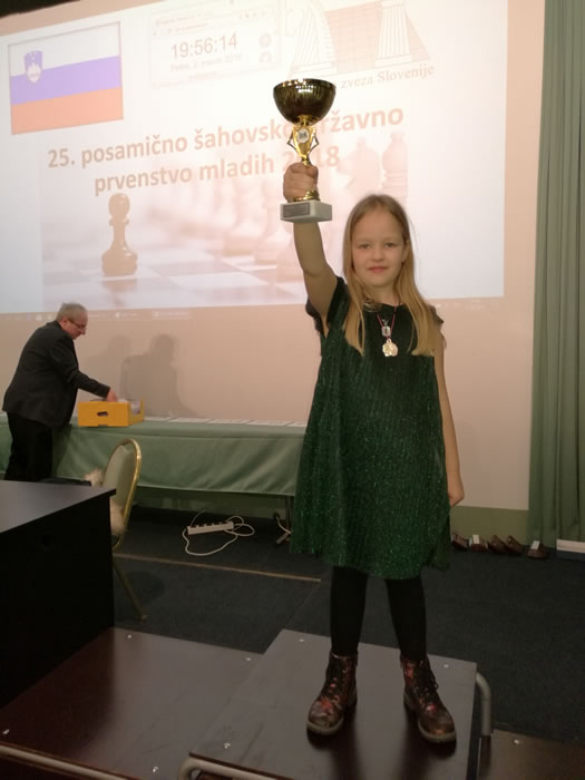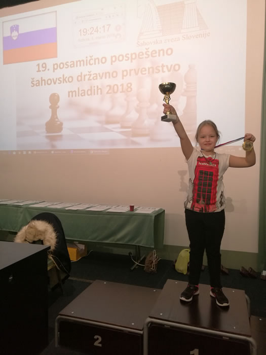 Sedemletna Inti Maček, ki igra za Šahovski klub Komenda, je na državnem šahovskem prvenstvu, ki se je v organizaciji Šahovske zveze Slovenije te dni odvijal v Portorožu, v kategoriji do 8 let osvojila kar dva naslova šahovske državne prvakinje, in sicer naslov državne prvakinje v standardnem šahu in naslov državne prvakinje v pospešenem šahu.