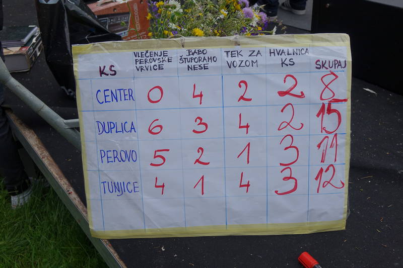 Okrepčilo je zagotovo najbolj prišlo prav tekmovalcem iz ekip krajevnih skupnosti Duplica, Tunjice, Center in Perovo, ki so se, podprti z obilico smeha in vzpodbujanja svojih navijačev, pomerili v različnih tekmovalnih disciplinah, od vlečenja vrvi na brvi, nošenja deklet prek Bistrice, teka za vozom in na koncu tudi v prepevanju hvalospevov domači krajevni skupnosti.