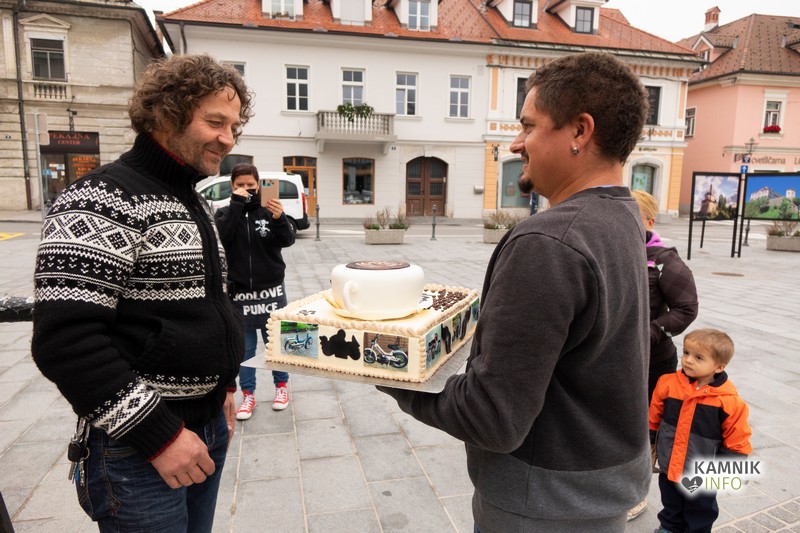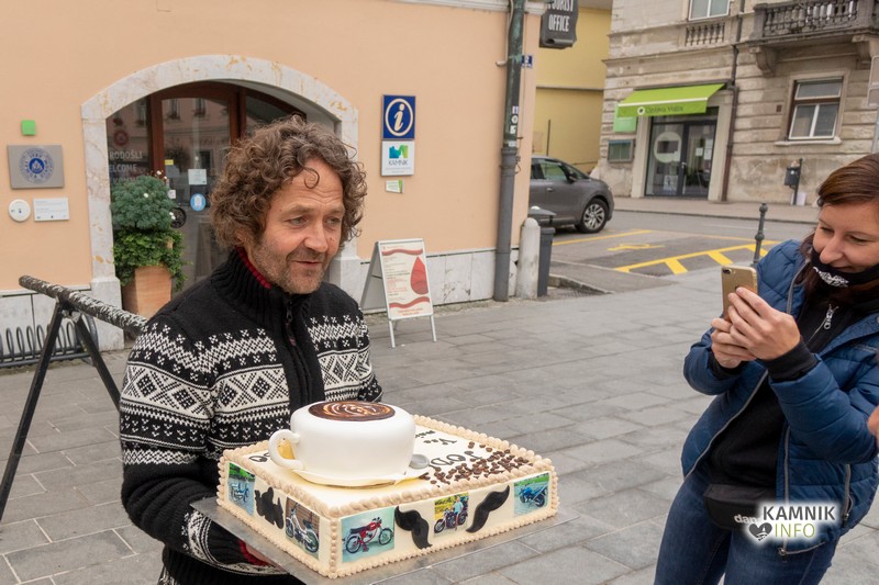 Ampak nič ne de, trg pred kamniškim TIC-om je bil, kljub neudeležbi turistov in občanov, ki bi bili željni novega znanja, poln. Jože Galičič – “Jodl” namreč praznuje okroglih petdeset let, vsak mimoidoči občan pa se rad pomudi pred Cafe Racerjom in čestita legendi kamniških baristov za abrahama.