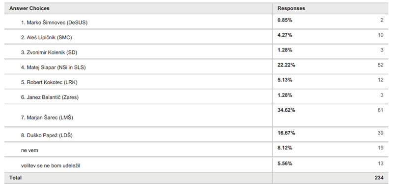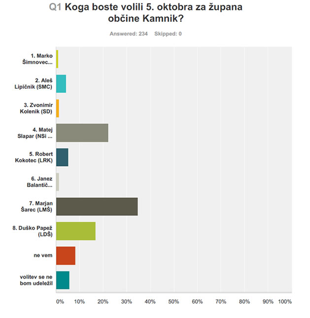 Na spletne ankete se sicer ne gre preveč zanašati, so pa, v predvolilnem času, vseeno zanimive. Po anketi, ki jo je, v zadnjih dveh tednih, opravila NSi Kamnik, v sodelovanju z Inštitutom dr. Janeza Evangelista Kreka (IJEK), naj bi se v drugem krogu županskih volitev pomerila Marjan Šarec in njihov županski kandidat Matej Slapar.