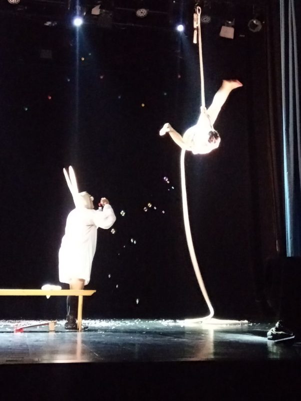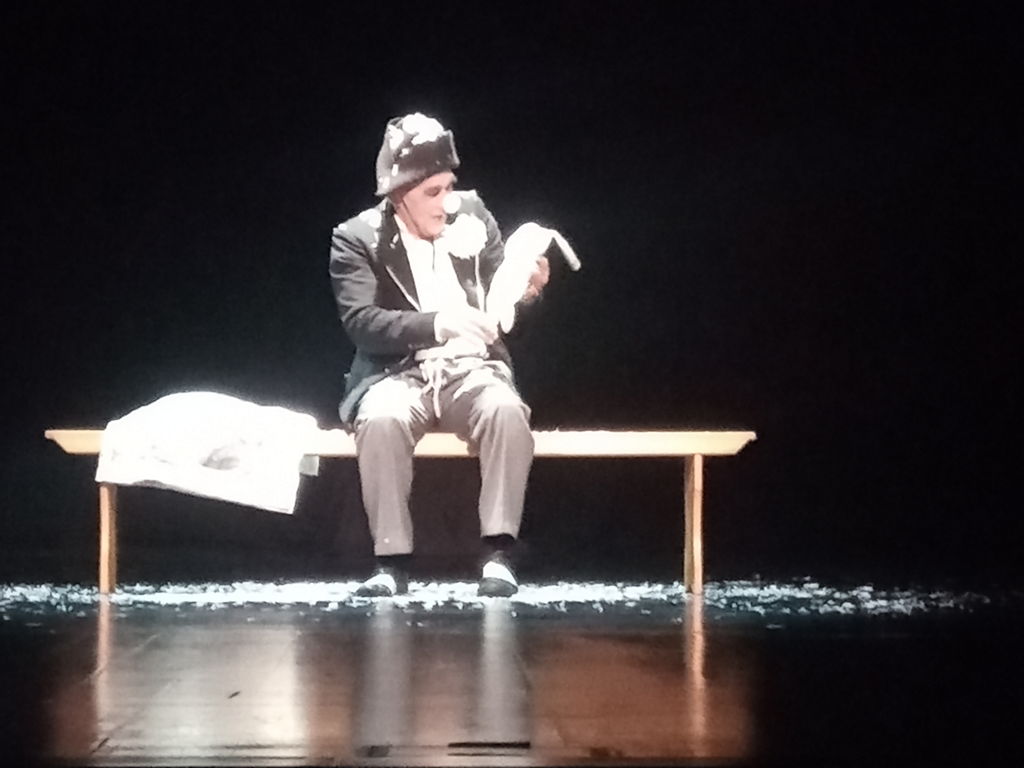 Osamljen klovn, ki z nogo kotali zvitek časopisa, dokler ga počasi ne prižene do klopi, kjer ga razgrne in se iz neba nenadoma spusti plišast bel zajček skupaj s “časopisnim” snegom, je domiselen uvod v predstavo, ki predstavlja preplet commedie dell’arte, cirkusa, (zračnega) plesa in poetične drame. Le-ta reflektira zgodbo, ki med drugim odslikava stanje samote, odtujenosti, socialne izključenosti in iskanja pristnih stikov z ljudmi, pa četudi le s tistimi, ki so že mrtvi. Zraven klovna, ki bi prav gotovo lahko poosebljal brezdomca, boema ali možakarja, užaloščenega zavoljo smrti svoje žene, se v nekem trenutku po bližnji vrvi spusti v belo oblečeno dekle (v vlogi Ane Lekše, uveljavljene plesalke, ki se v belgijskem Leuvnu ukvarja s t. i.zračnimi tehnikami, ki se jih je pred desetletjem naučila pri plesnem mentorju Branku Potočanu), ki se kot akrobatka nekaj časa kot nekakšna velikanska snežinska vrtinči v zraku. Ko prispe do njega, ga povabi s sabo navzgor v nebo in pri tem vzbuja videz angela, ki za svoj spremstvo ne želi prejeti denarja. Ko prispe onstran, mu druga ženska (Natalia Sultanov) nadane zajčja ušesa, s katerimi zavzame povsem drugo, precej komično vlogo, s katero se več kot očitno precej hitro poistoveti.