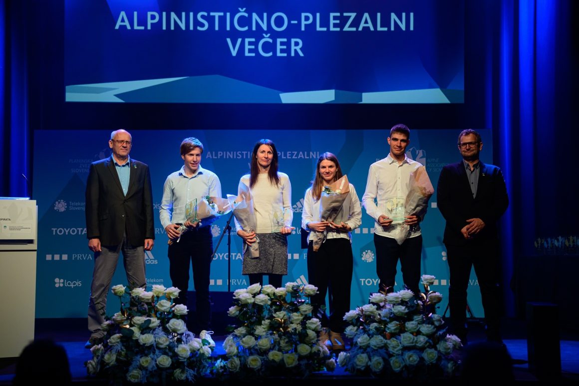 Najuspešnejša tekmovalna ledna plezalca Gregor Šegel in Maja Šuštar Habjan ter najuspešnejša tekmovalna turna smučarja Klara Velepec in Klemen Španring s podpredsednikom PZS Jožefom Bobovnikom in generalnim sekretarjem PZS Damjanom Omerzujem. (foto Martin Metelko/PZS)