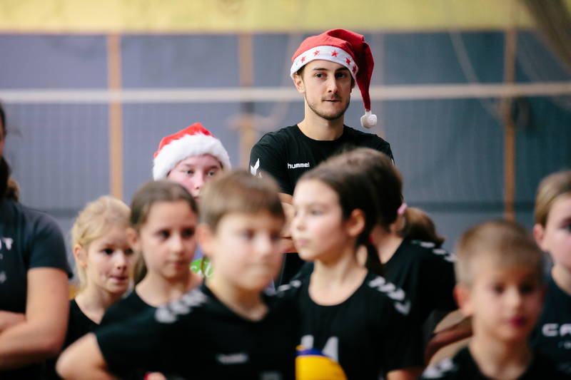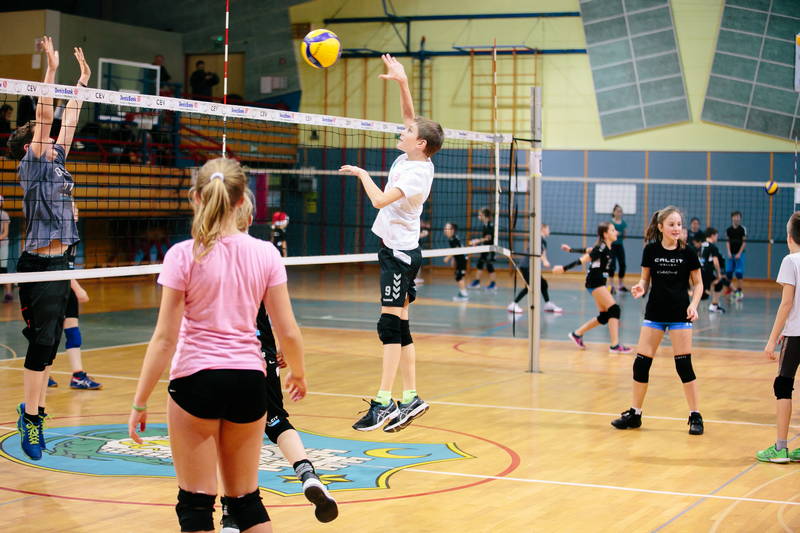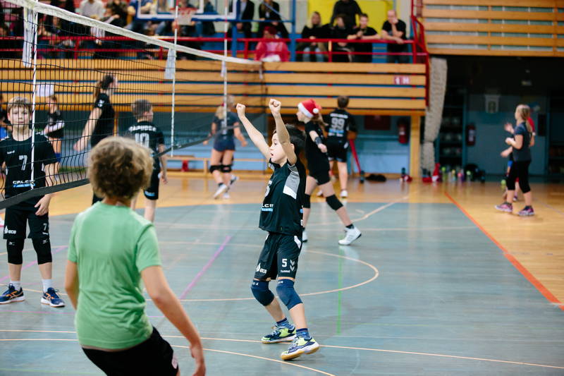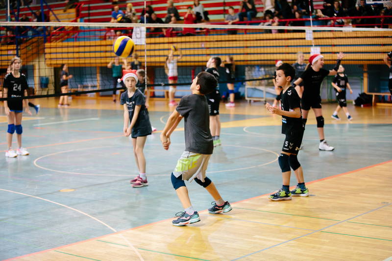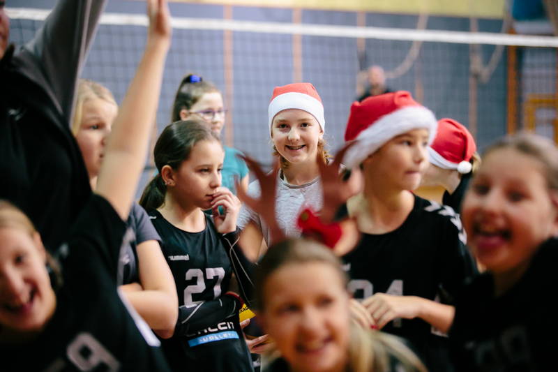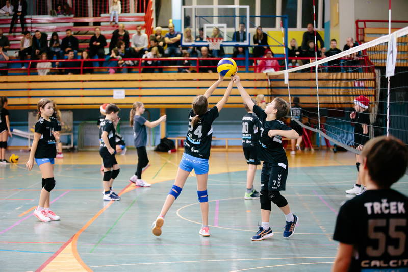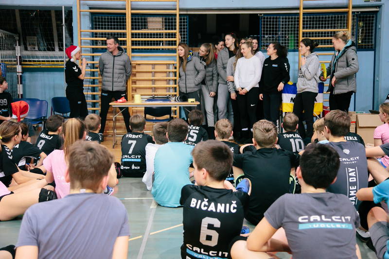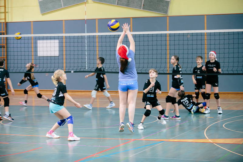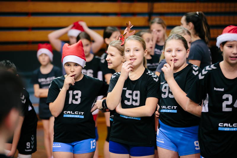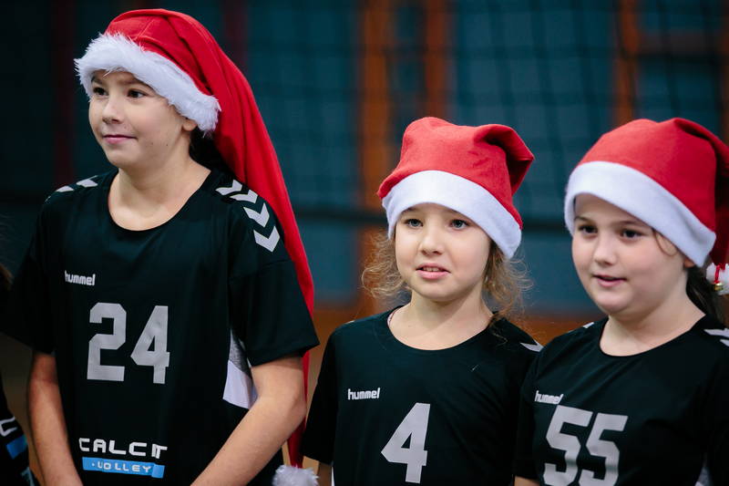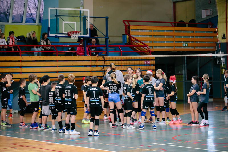 Na igrišče so najprej stopili mini odbojkarji in odbojkarice. Sodelovalo je kar petnajst ekip najmlajših Calcitovcev. Za njimi so na vrsto prišlo mali odbojkarji. Osem sodelujočih ekip je po besedah Božičkove pomočnice, trenerke Katarine Vraber, prikazalo zelo lepo igro. Sredi turnirja je sledilo prvo presenečenje. Božiček je med navijače pripeljal članice prve ženske ekipe Calcit Volley, najmlajši pa so jim obljubili, da jim bodo uslugo vrnili že januarja, ko bo v prav tej dvorani potekal zaključni turnir pokala Slovenije.