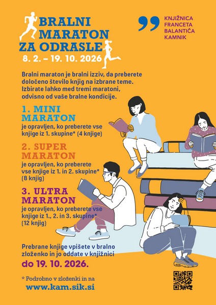 Od 8. februarja do 19. oktobra 2026 bo potekal letošnji Bralni maraton za odrasle. Vabljeni vsi ljubitelji branja, da se znova podate na bralno pot skozi raznolike teme in zgodbe.