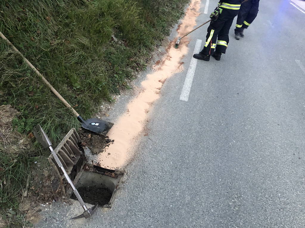 Po prometni nesreči Košišah so kamniški gasilci poskrbeli za očiščenje kakih 20 metrov dolgega oljnega madeža, ki se je razlil po klancu.