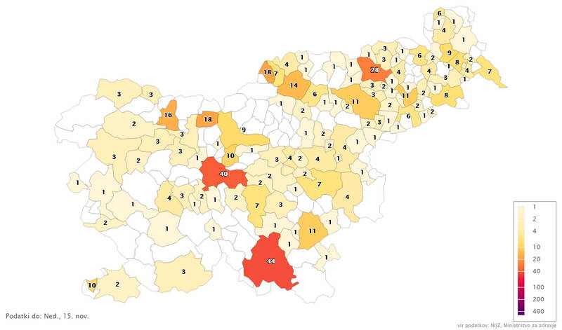 - Potrjene okuzbe v nedeljo, 15. 11. 2020 – Vir: Sledilnik COVID-19