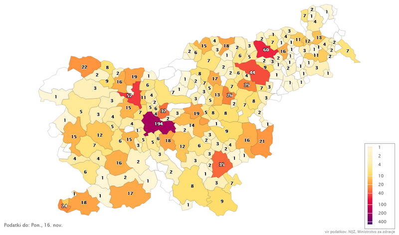 - Potrjene okuzbe v ponedeljek, 16. 11. 2020 – Vir: Sledilnik COVID-19