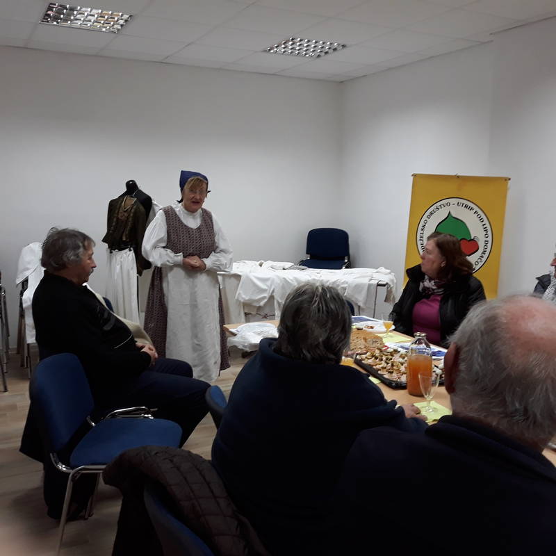 Nato je prevzela besedo predsednica Ančka Podbevšek in podala program društvenih dogodkov za leto 2019. Po točki razno nas je s svojim nastopom razveselila gostja večera, gospa Veronika Pogačar iz Radomelj in predstavila lepe primerke starejše oblačilne tehnike za ženske in moške, značilne za čase, ko so ljudje bili revni in je tudi obleka bila zelo enostavna, večinoma brez posebnega spodnjega perila, a praktična za vsakdanjo rabo. Gospa se z zbiranjem že pozabljenih in velikokrat zavrženih oblačil ukvarja čisto samo iniciativno, se udeležuje razstav in tudi nas je na povabilo g. Zabavnika prijazno obiskala. Zelo smo je bili veseli in se ji zahvaljujemo za ta obisk.