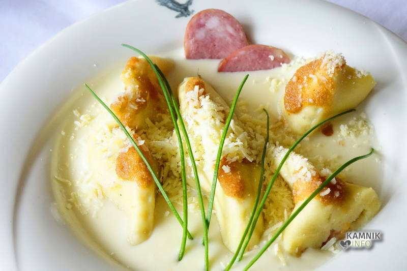 - Krompirjeve skalce s kajžersko klobaso v sirovi omaki s trničem