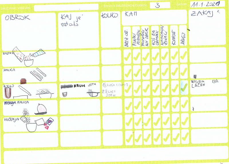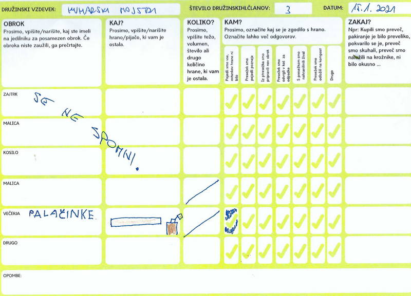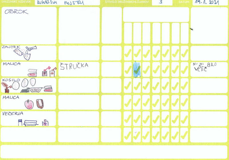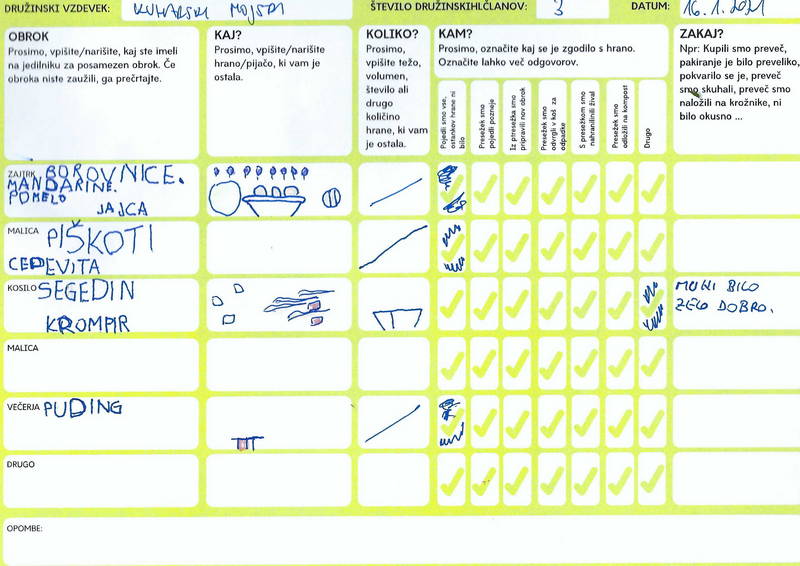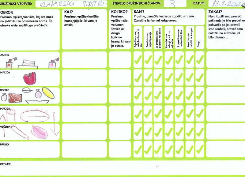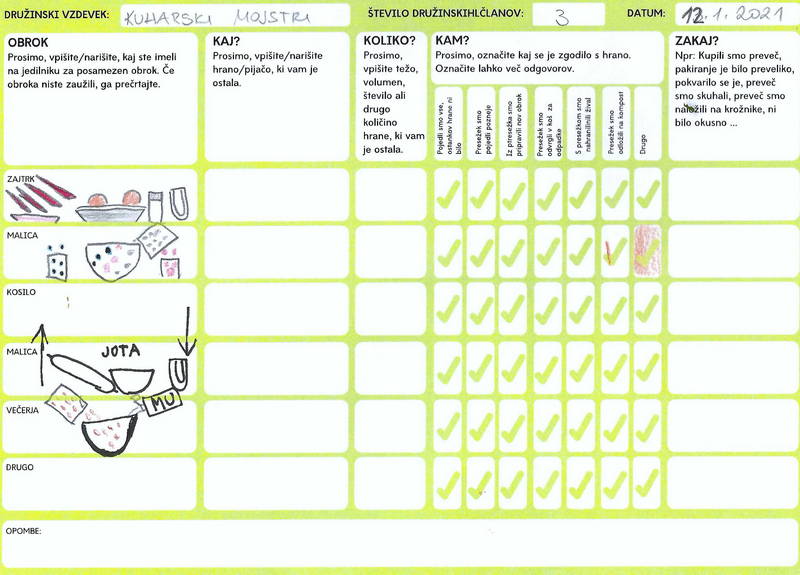 Predstavljamo vam Kuhlin dnevnik zavržene hrane Kuharskih mojstrov – to je družina našega Jona in Ize Turk. Jon je izjemno ustvarjalno pripomogel k likovni opremi dnevnika, pa tudi k idejam in razlagam. Pri tem je bil tudi zelo iskren, saj je lepo povedal tudi takrat, ko mu ni bilo dobro, ali ni bil lačen, ali pa mu preprosto ni bilo všeč. Vsa pohvala gre tudi Jonovim in Izinim staršem, ki so zavzeto sodelovali in jima pomagali pri sami dejavnosti. Res, hvala.