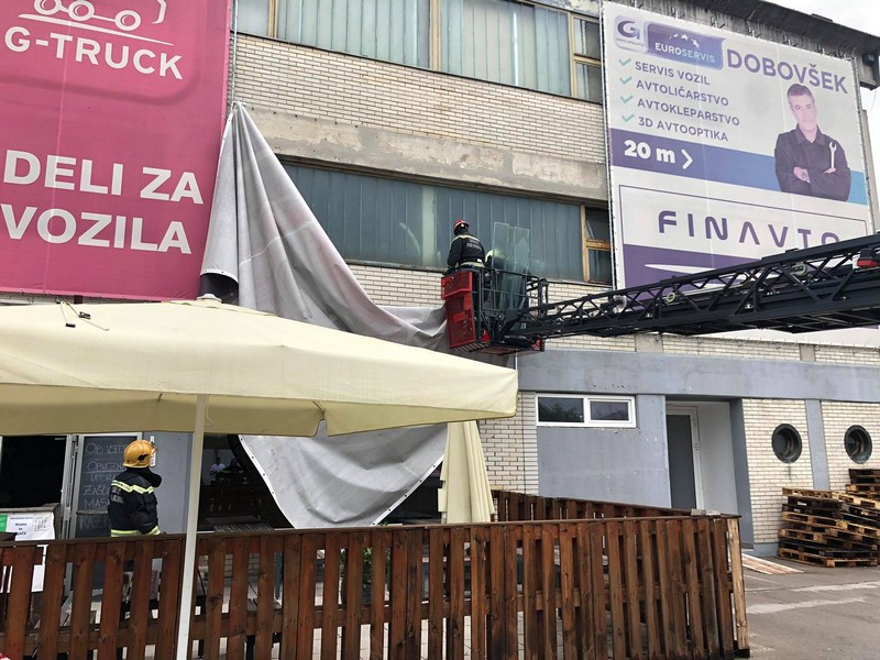 Okoli 17. ure so bili gasilci na pomoč poklicani tudi v Šmarco, kjer jo je zagodla popoldanska nevihta. Le-ta je s pročelja poslovne stavbe odtrgala oglasni pano, ki je pri padcu razbil steklo tamkajšnje pivovarne oz. pivnice, zaradi česar je grozilo, da bo voda oz. deževnica zalila tudi prostore.