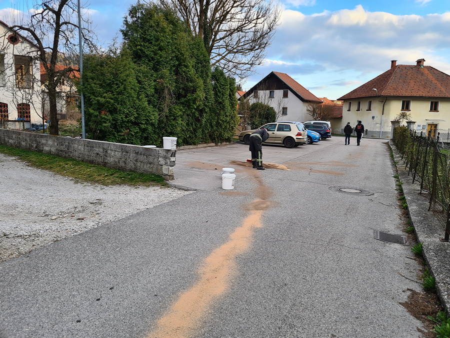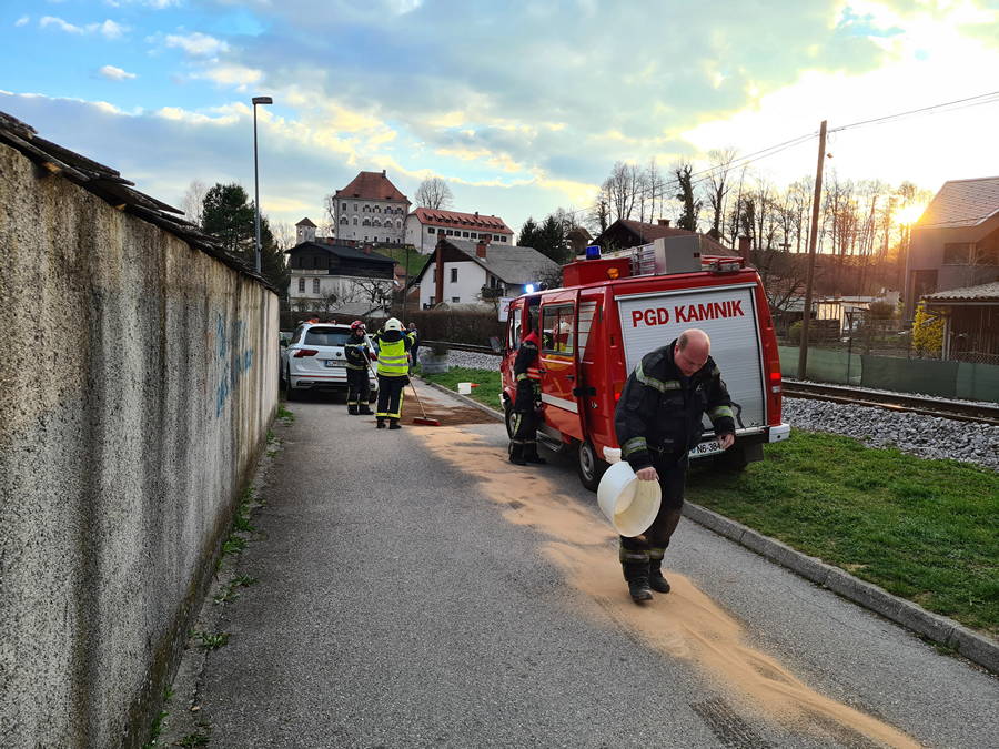 Na pomoč naravi, stebričku in nasedlima voznikoma, so urno prihiteli vrli gasilci PGD Kamnik, ki so mastno, kakih 200 metrov dolgo mavrično kačo, ki je s svojo spolzkostjo ogrožalo trtice občanov in ribji živelj, hiteli posipati z vpojnim sredstvom, da pa se spolzka strupenjača ni mogla skriti v odtočni jašek, pa so le-tega zatesnili ter, za dobro mero, na koncu še očistili in pometli cestišče.