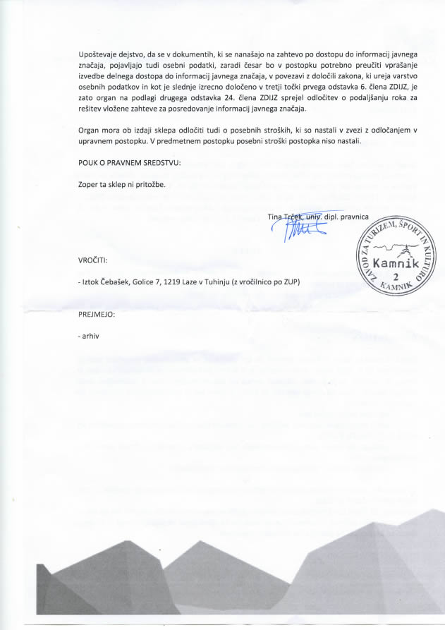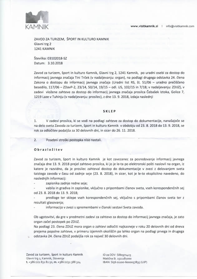 3. 10. 2018, nam je Tina Terček, sicer vodja oddelka za družbene dejavnosti Občine Kamnik, ki pa ni članica sveta omenjenega zavoda, oz. je, sodeč po navedbah iz dopisa, zgolj uradna oseba za dostop do informacij javnega značaja pri ZTŠK Kamnik, poslala namreč sklep, opremljen z glavo in žigom ZTŠK Kamnik, v katerem je navedeno, da se rok za odločitev podaljša za nadaljnjih 30 dni, in sicer z obrazložitvijo, da naj bi šlo za “izjemne okoliščine”, ki si jih lahko preberete priloženi kopiji sklepa. Če na kratko povzamemo “izjemne okoliščine”, gre pri vsem skupaj zgolj za to, da nekdo na nekaj dokumentih s črnim flomastrom potegne nekaj črt, s katerimi prikrije osebne podatke, ki niso za javnost.
