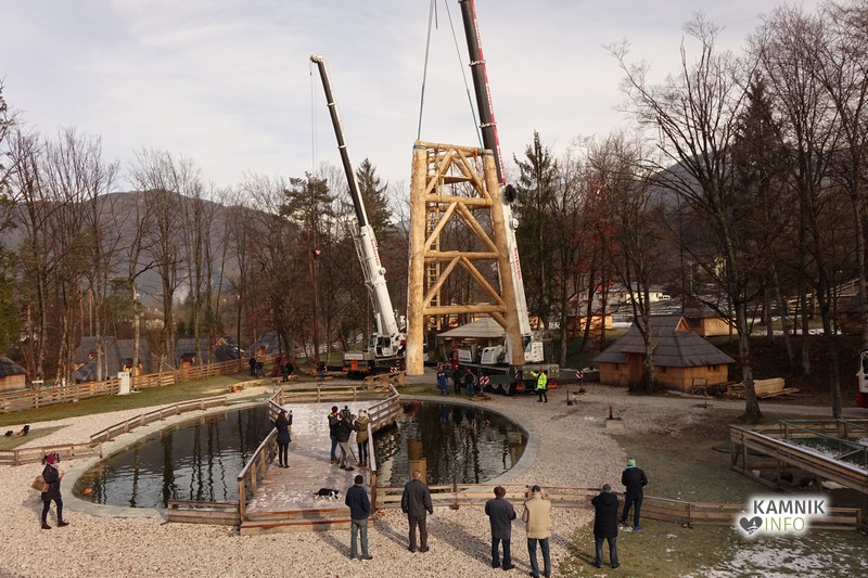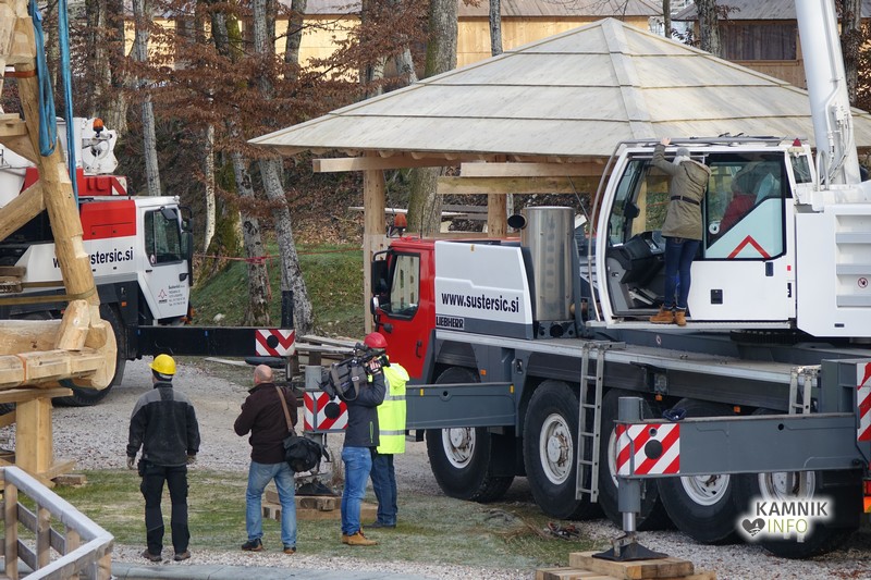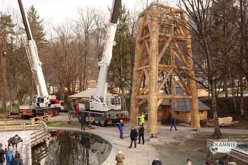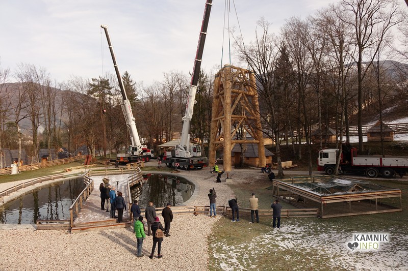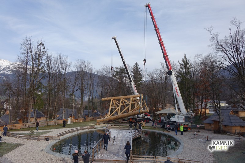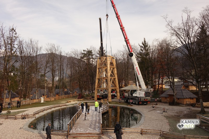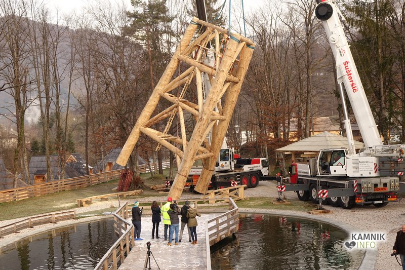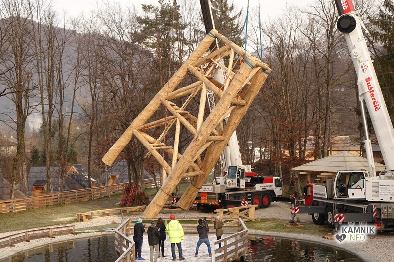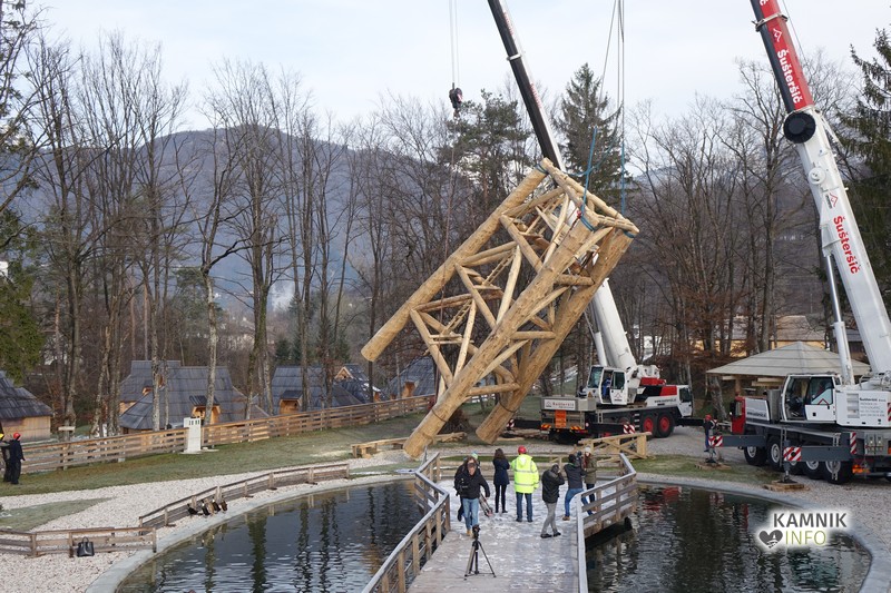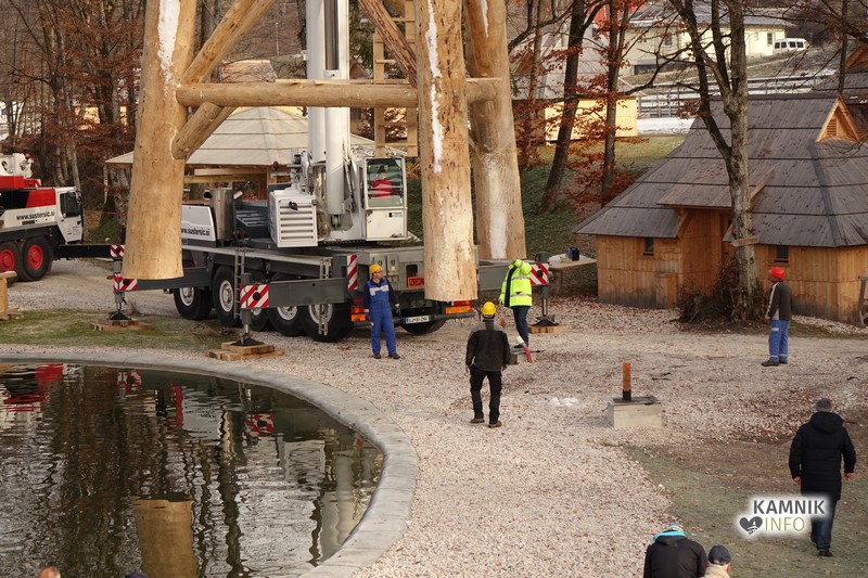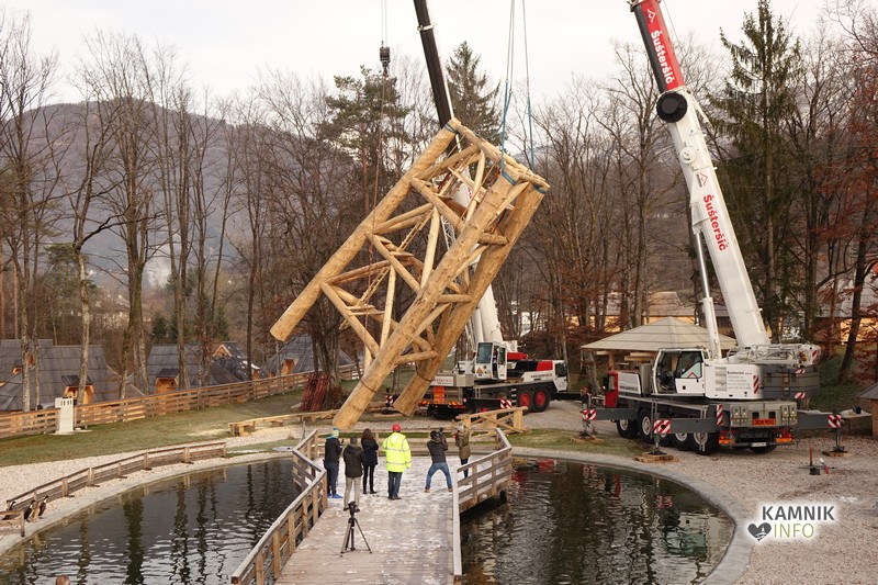 Ob deseti uri so v Eko resortu pod Veliko planino začeli s postavljanjem ogromne lovske opazovalnice, ki naj bi bila največji tovrstni objekt na svetu.