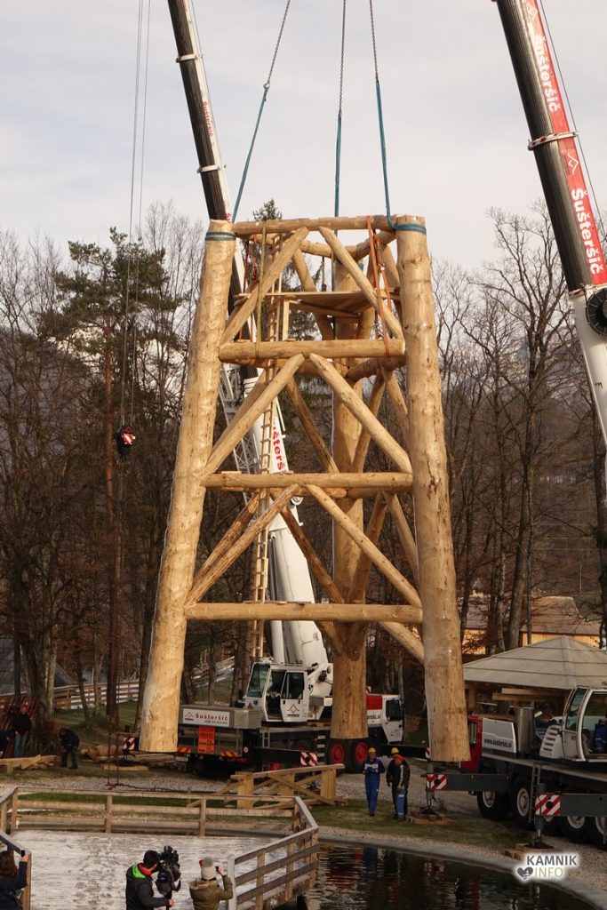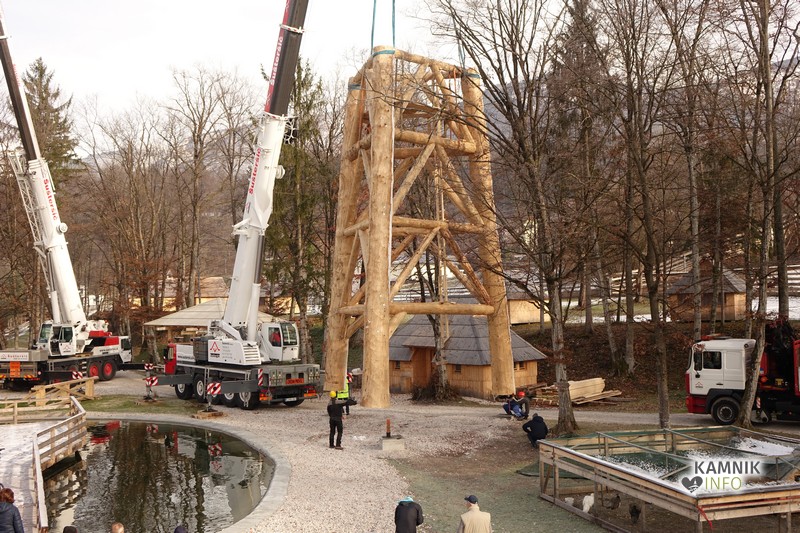 Tehnično kar precej zahteven podvig se je začel odvijati ob 10. uri dopoldan, ko so delavci s pomočjo dveh velikih avtodvigal dvignili in uspešno postavili spodnji, največji in najtežji del celotne konstrcije oz. podnožja lovske opazovalnice, ki v višino meri okrog 12 metrov.