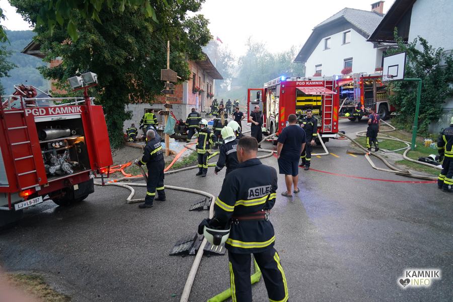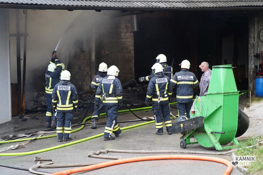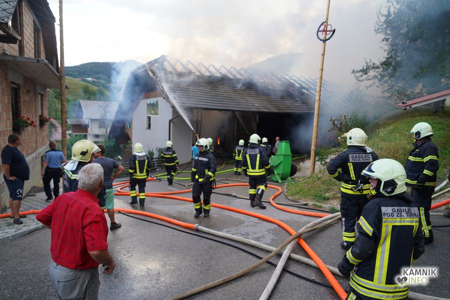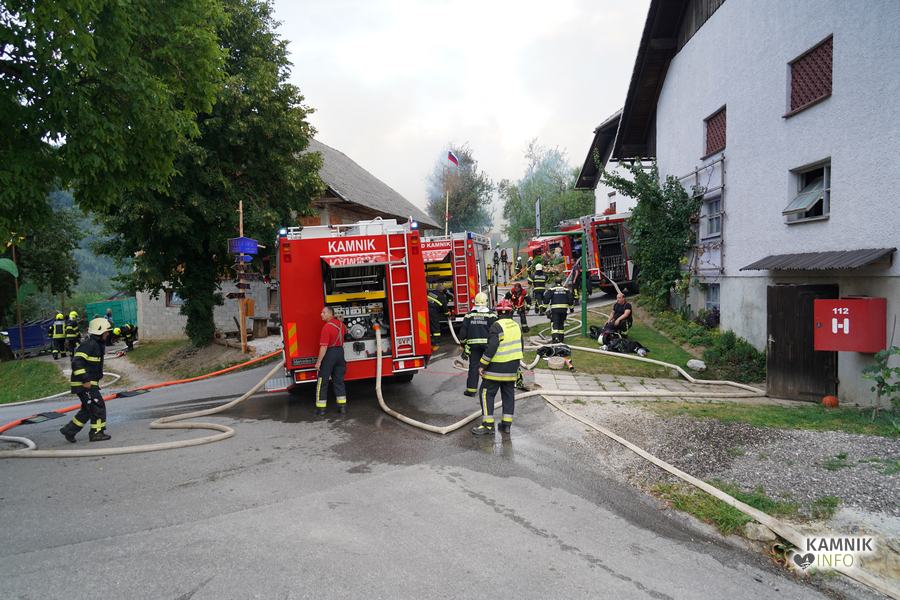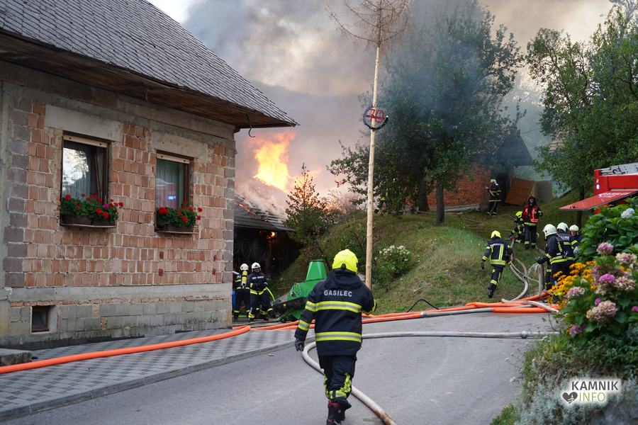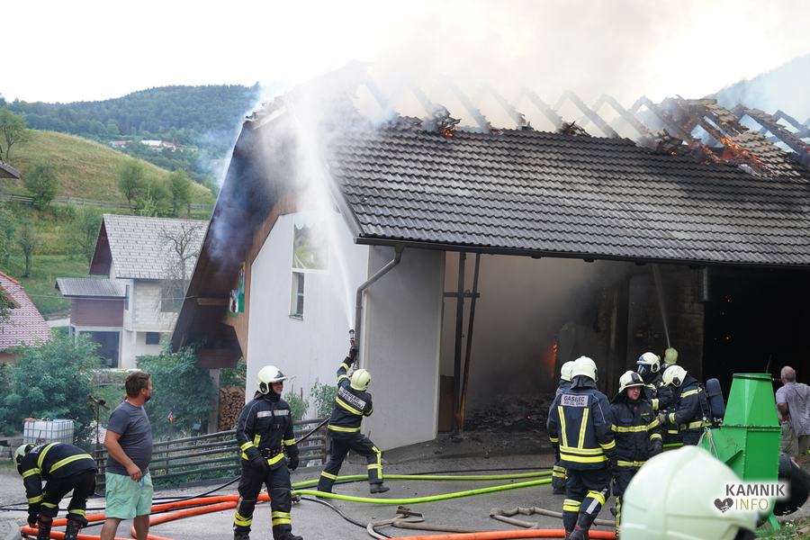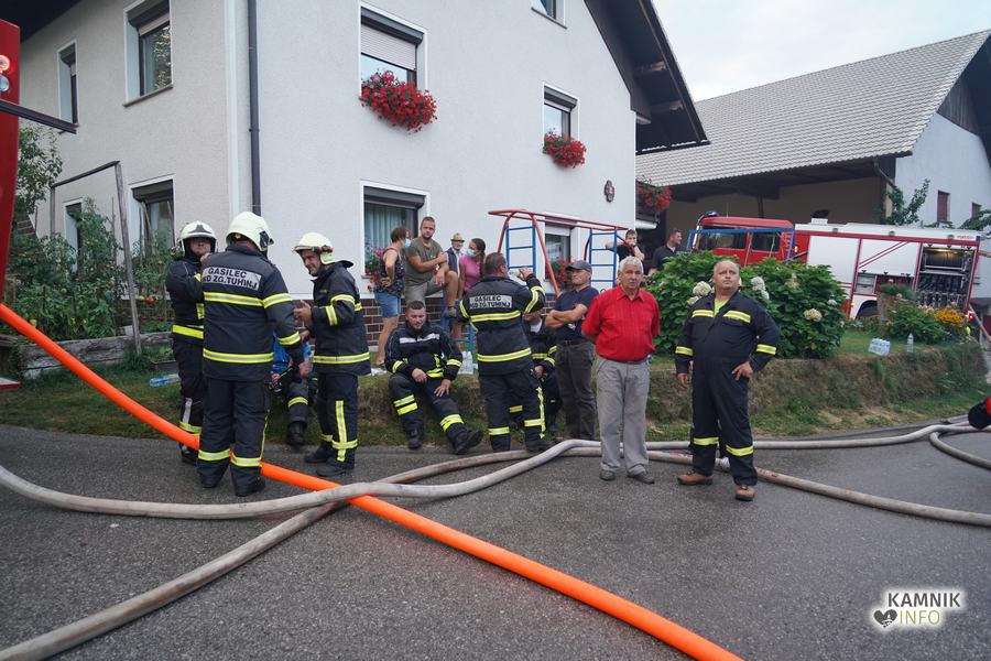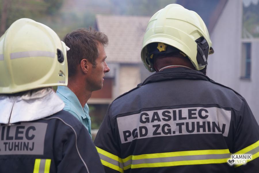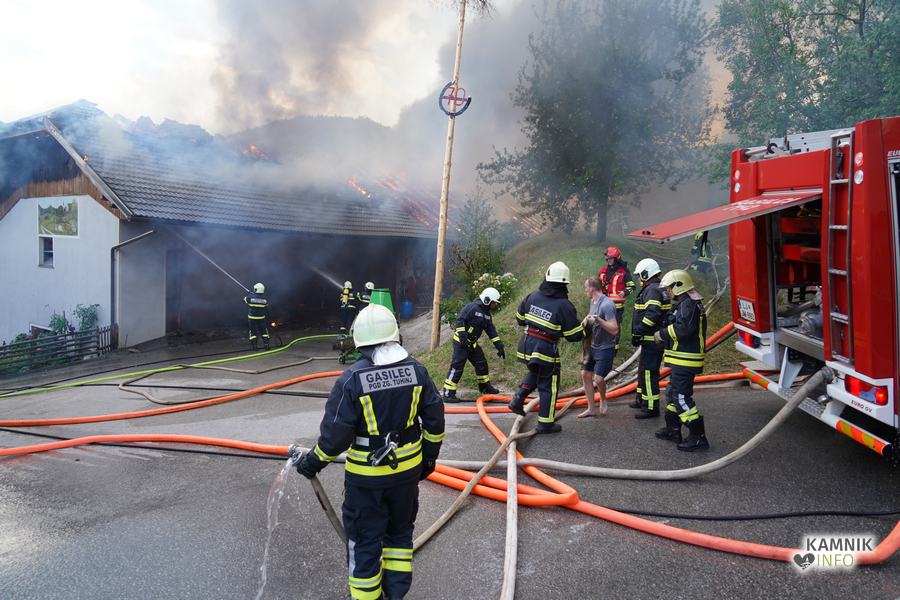 S plameni, ki so se iz ostrešja gospodarskega poslopja dvigali visoko proti nebu ter grozili, da v strnjenem naselju zajamejo še kak bližnji objekt, so se že čez nekaj minut, z domala vso razpoložljivo gasilsko ter tudi gradbeno mehanizacijo, spopadli gasilci prostovoljnih gasilskih društev Zgornji Tuhinj, Šmartno v Tuhinju, Kamnik, Srednja vas in Špitalič, posredno pa tudi gasilke in gasilci PGD Šmarca, ki so prevzeli dežurstvo v Kamniku.