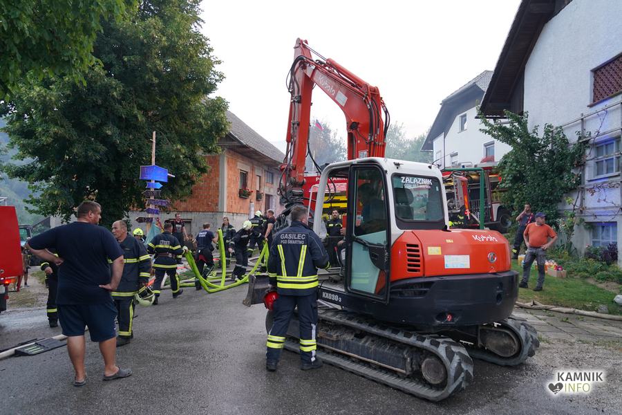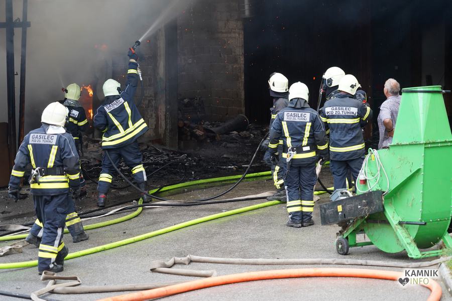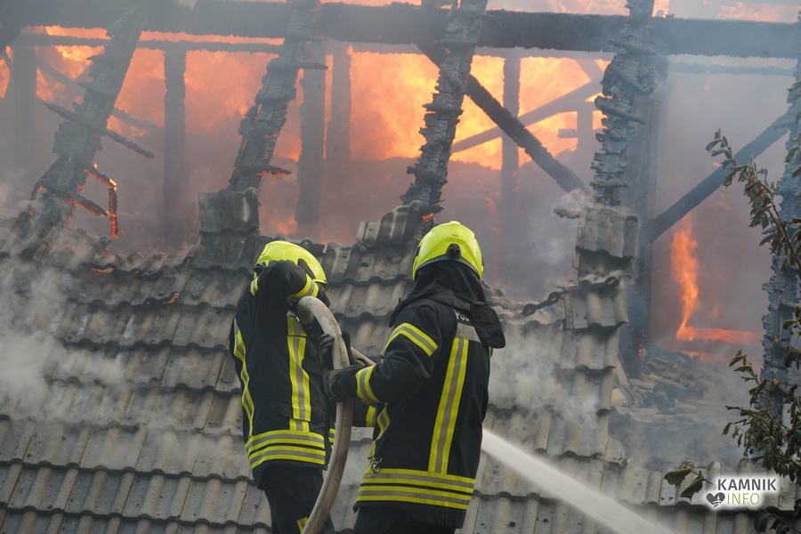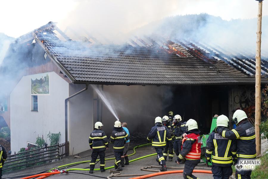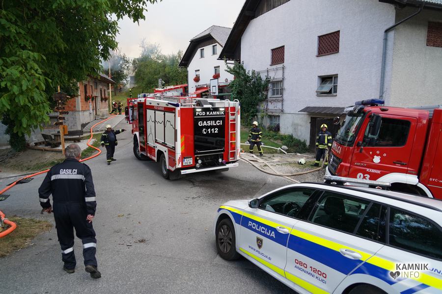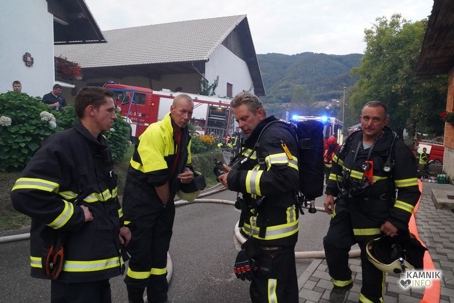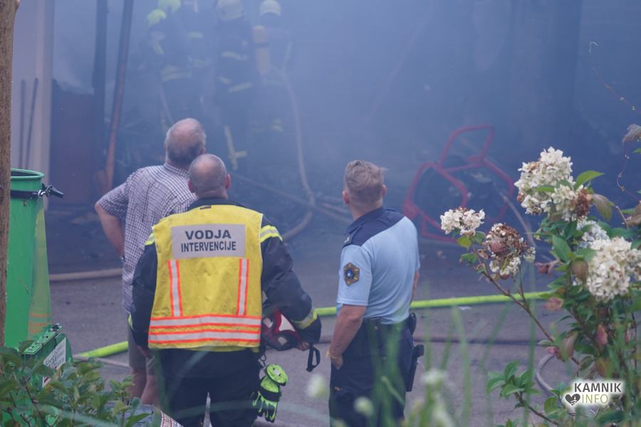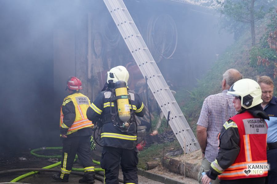 S plameni, ki so se iz ostrešja gospodarskega poslopja dvigali visoko proti nebu ter grozili, da v strnjenem naselju zajamejo še kak bližnji objekt, so se že čez nekaj minut, z domala vso razpoložljivo gasilsko ter tudi gradbeno mehanizacijo, spopadli gasilci prostovoljnih gasilskih društev Zgornji Tuhinj, Šmartno v Tuhinju, Kamnik, Srednja vas in Špitalič, posredno pa tudi gasilke in gasilci PGD Šmarca, ki so prevzeli dežurstvo v Kamniku.