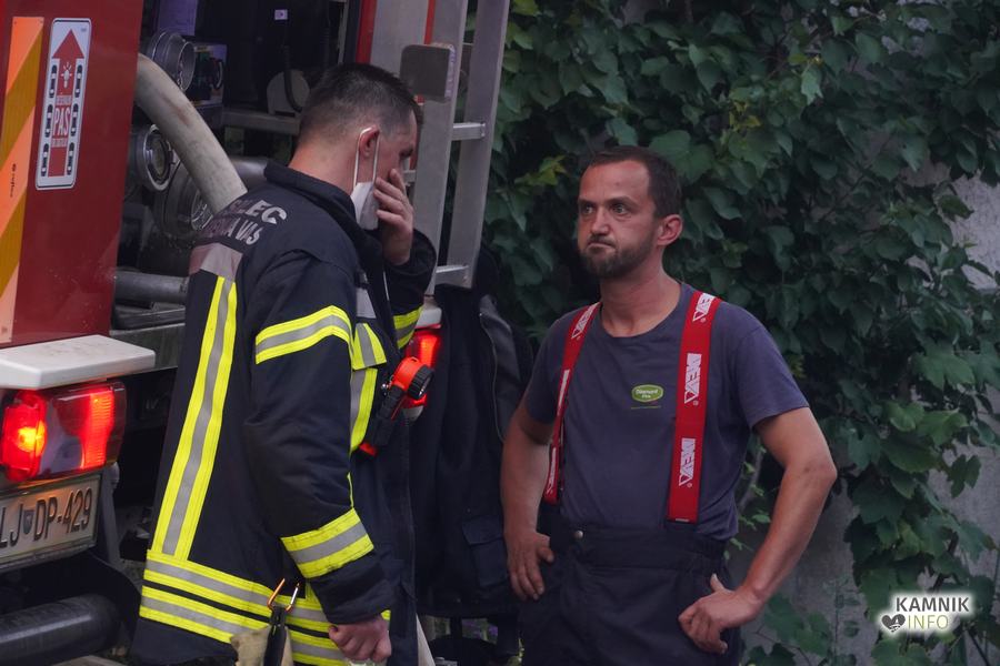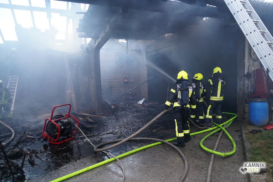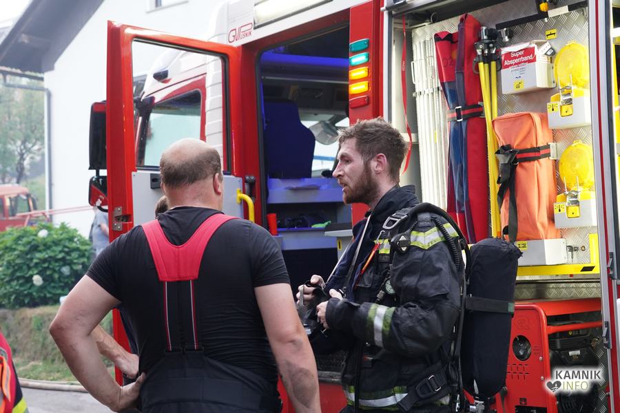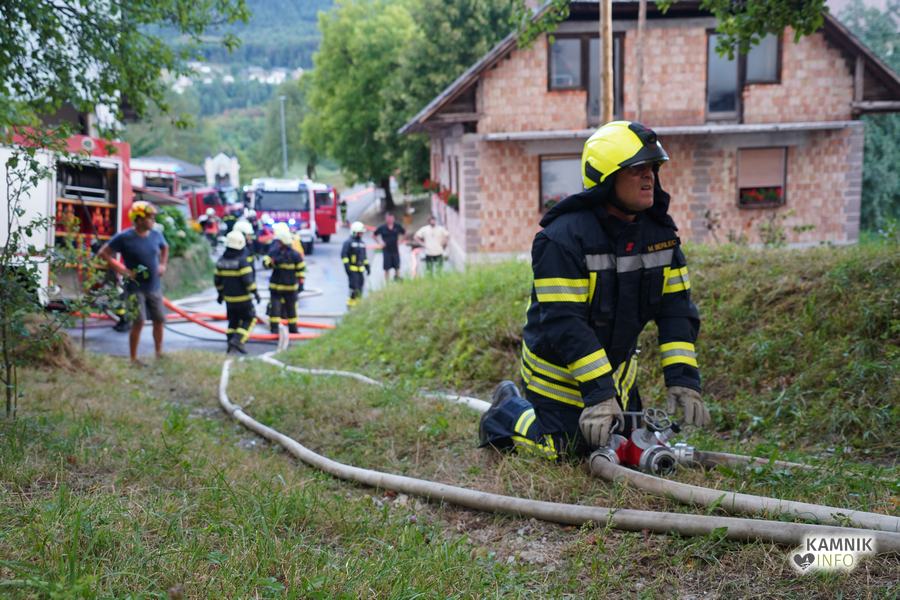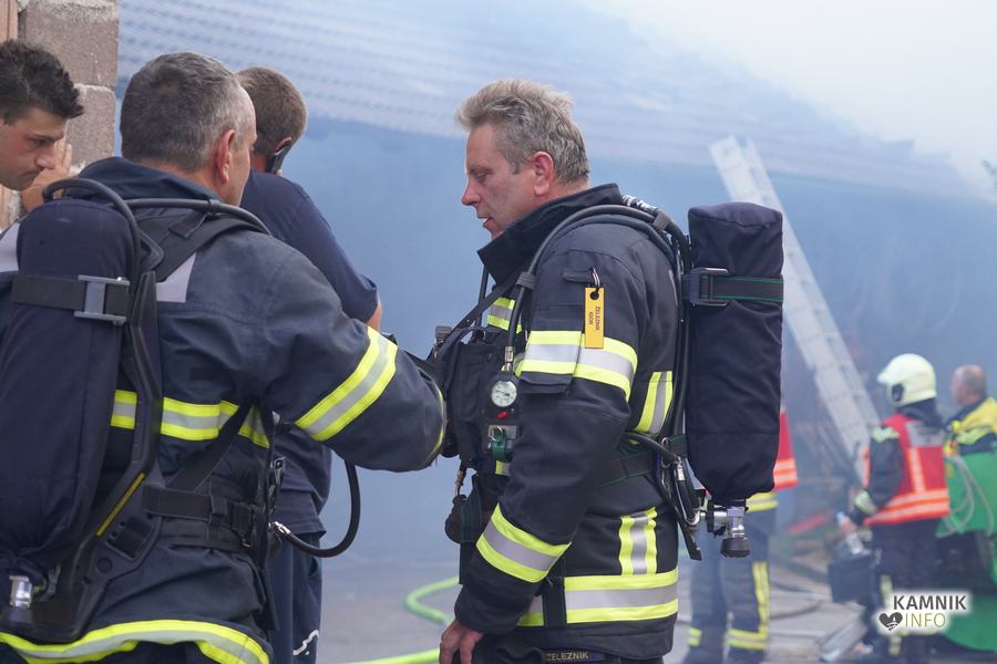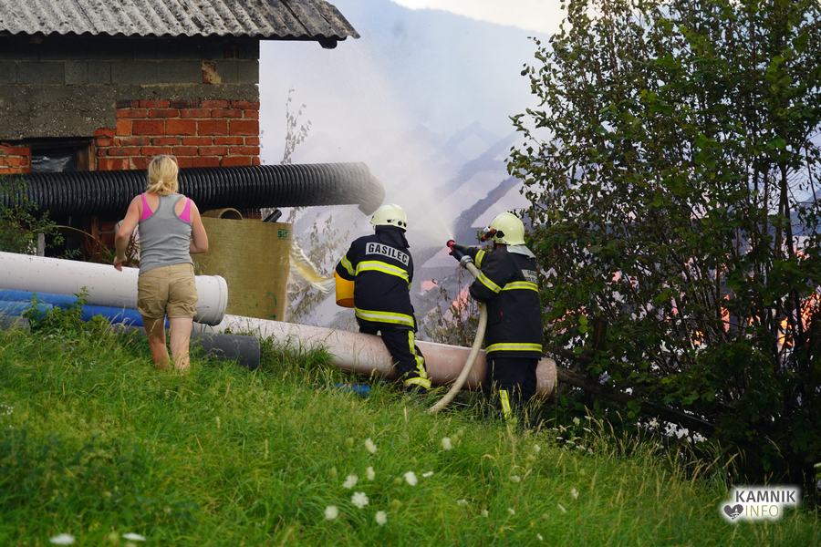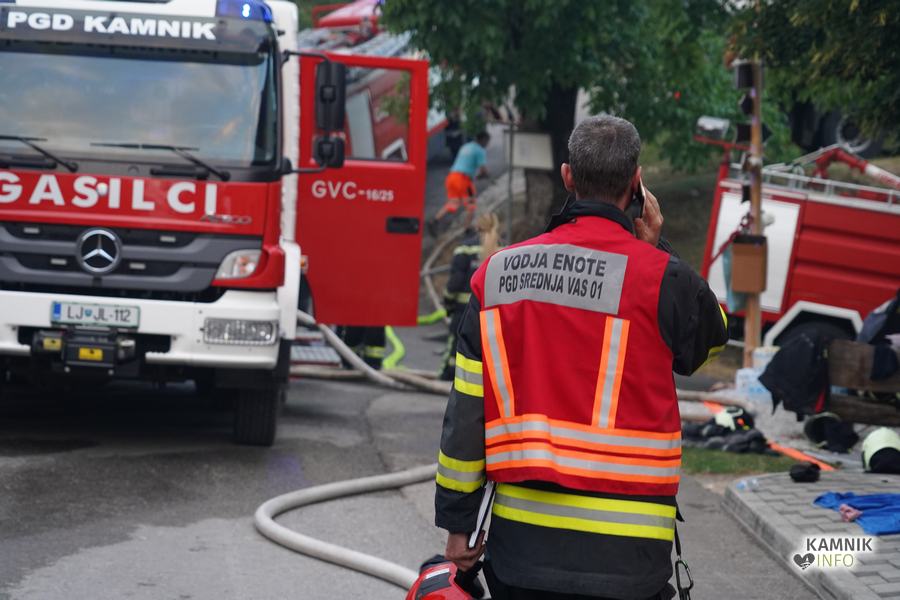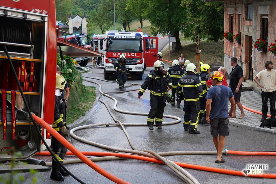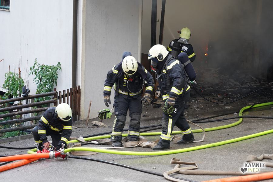 S plameni, ki so se iz ostrešja gospodarskega poslopja dvigali visoko proti nebu ter grozili, da v strnjenem naselju zajamejo še kak bližnji objekt, so se že čez nekaj minut, z domala vso razpoložljivo gasilsko ter tudi gradbeno mehanizacijo, spopadli gasilci prostovoljnih gasilskih društev Zgornji Tuhinj, Šmartno v Tuhinju, Kamnik, Srednja vas in Špitalič, posredno pa tudi gasilke in gasilci PGD Šmarca, ki so prevzeli dežurstvo v Kamniku.