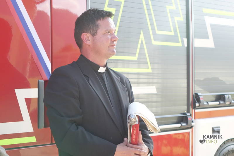 Po kratkih ampak nadvse spodbudnih besedah govorcev je bil na oder vabljen tudi župnik Pavel Pibernik, ki je blagoslovil novo vozilo in vse zbrane gasilce, da jim bo dobro služil in jih tudi z božjo pomočjo varoval.