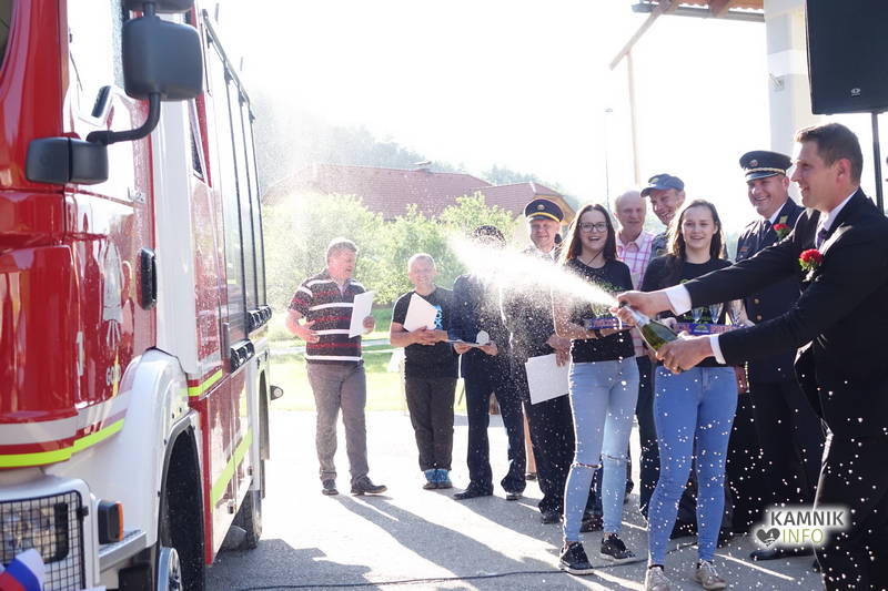 Po govorih in zahvalah je na vrsto prišel trenutek, na katerega so vsi nestrpno čakali: predaja ključev. Župan Matej Slapar je ključe novega vozila predal poveljniku društva Gašperju Šornu, ta pa jih je predal vozniku novega vozila Andreju Spruku, ki je podal zaobljubo. Andrej Spruk je po zaobljubi zagnal vozilo in prižgal sirene, botri, župan, predsednik in poveljnik ter ostali gostje pa so z odprtjem šampanjca nazdravili ob spremljavi godbe.