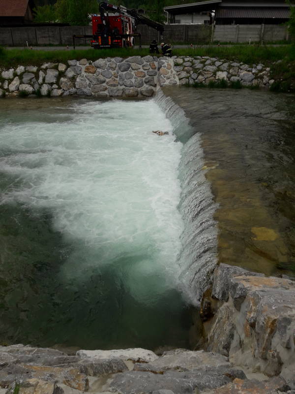 Kamniški gasilci so včeraj okrog 16:30 prejeli obvestilo, da se pod eno izmed kamnitih kaskad reke Kamniške Bistrice pri Molkovi poti nahaja truplo govedi.