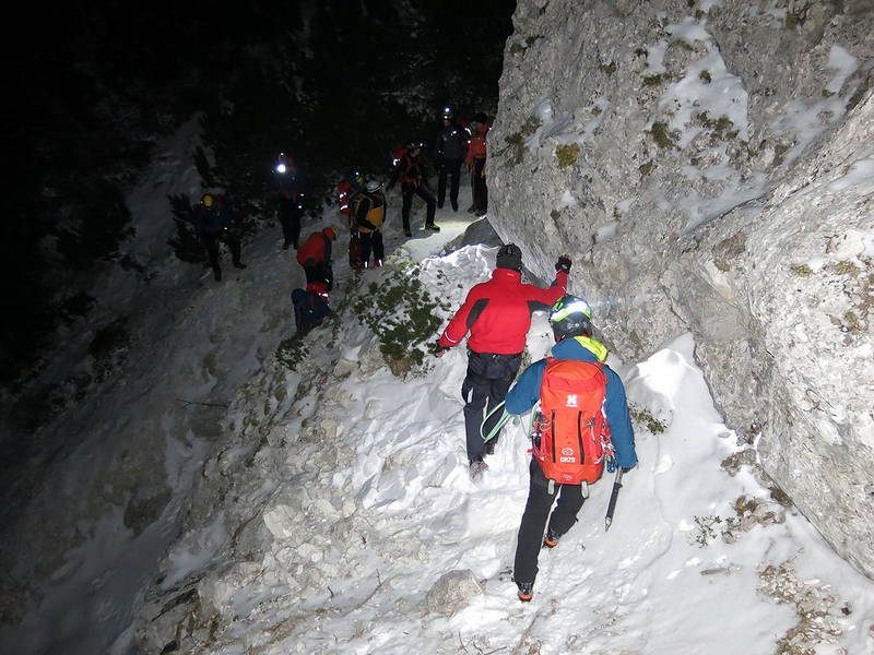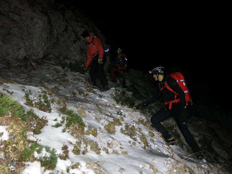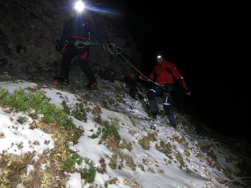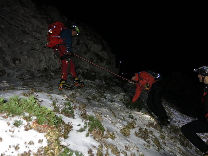 Po dobri uri od vzpostavitve vidnega kontakta so se gorski reševalci, prek ruševja in zahtevnega, domala povsem neprehodnega ter mestoma tudi zasneženega in poledenelega terena, do obeh iskanih prebili ob 21.11, ju navezali v navezo in varno ter nepoškodovana prepeljali v dolino.