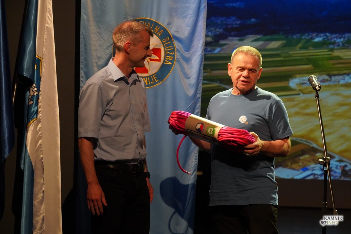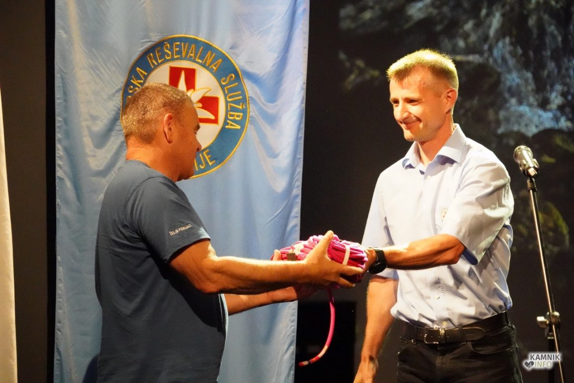 Z uporabnim simboličnim darilom je kamniškim gorskim reševalcem čestital tudi Gregor Dolinar, predsednik Gorske reševalne zveze Slovenije, ki je predsedniku kamniškega društva izročil dolgo, 100 metrsko vrv.