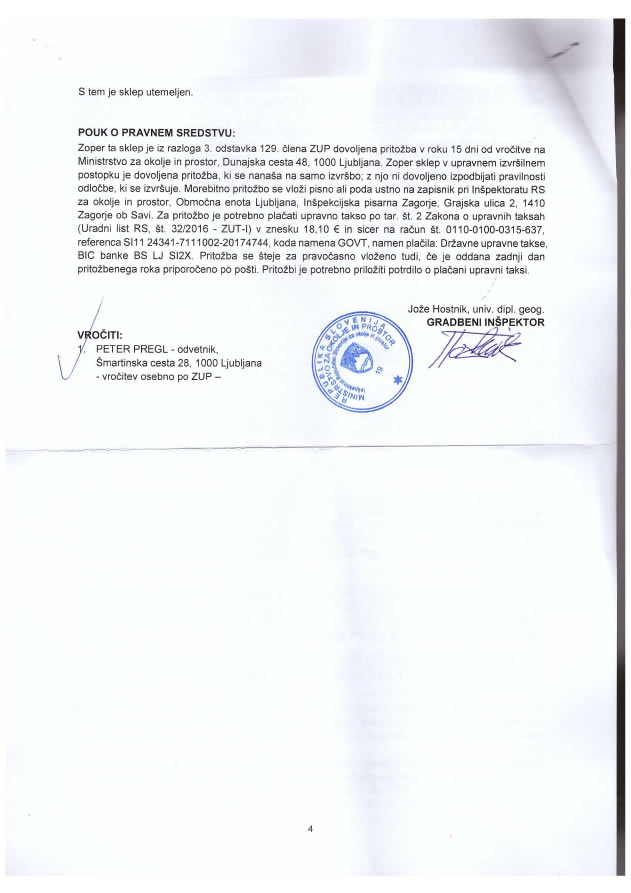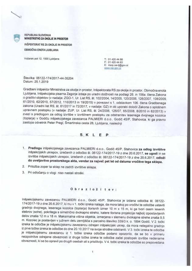 Sklep o odložitvi inšpekcijskih ukrepov (Vir: Palmieri d.o.o.)