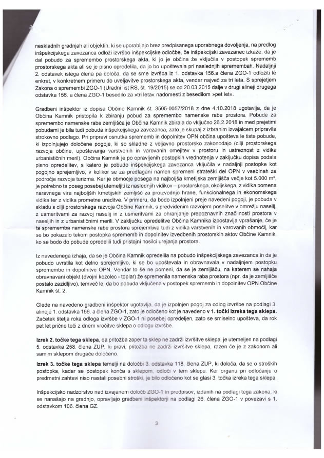 »Vloga za odlog izvršbe je bila vložena v zadevi gradnje kozolca in trenutno je samo v tej zadevi o odlogu izvršitve inšpekcijskih ukrepov tudi odločeno.