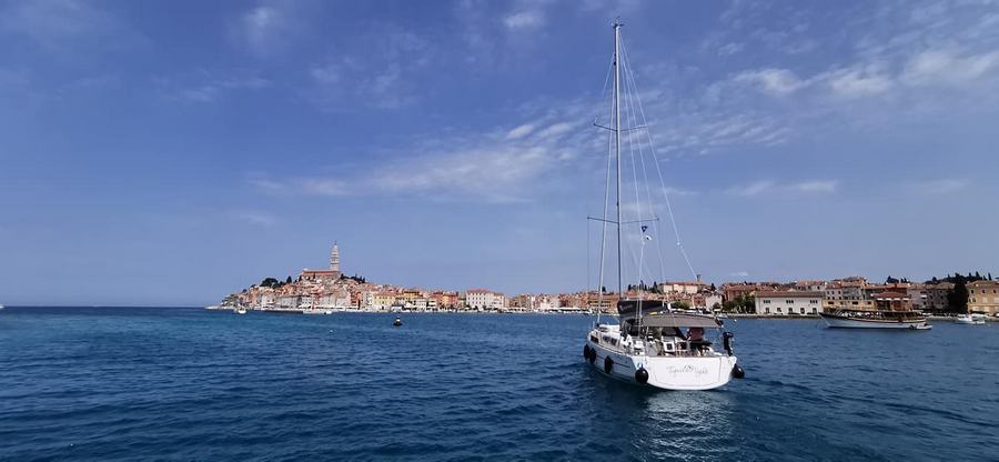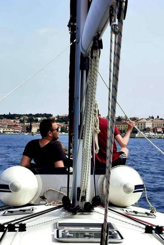 Po zajtrku smo ponovili vajo, pred enajsto pa je naša mala flota odplula na vodni ogled Rovinja. Pomahali smo Rovinju in odpluli v smeri Brionov, kjer smo se privezali okrog enih.