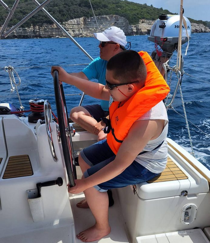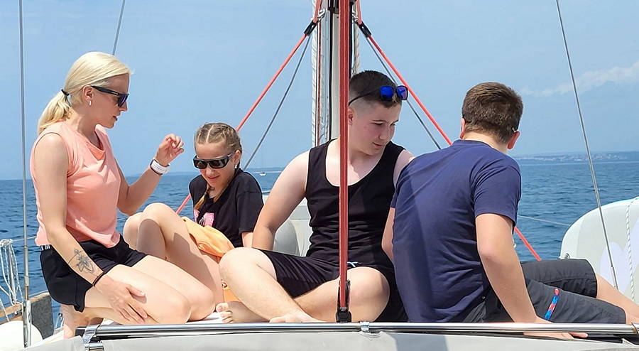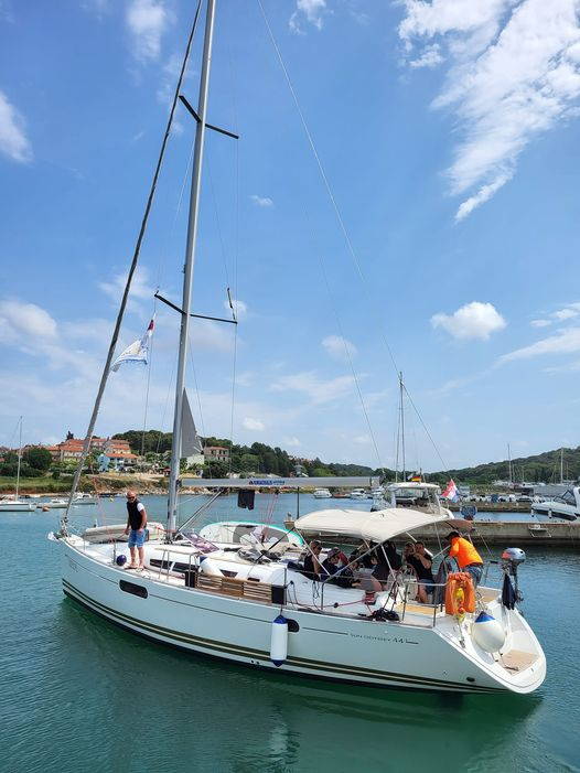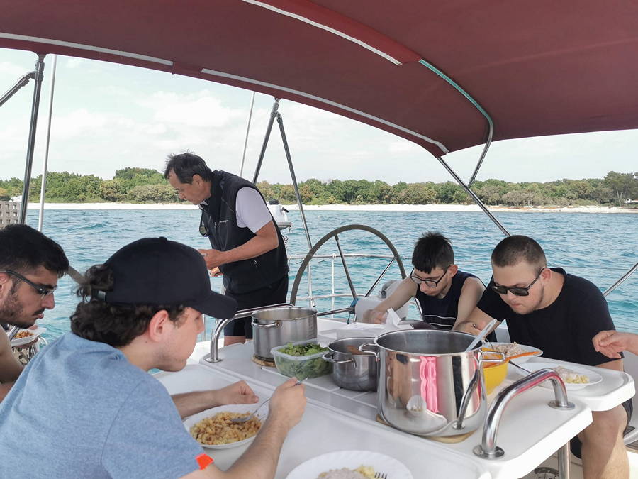 Sledilo je vkrcanje in spoznavanju jadrnice. Kmalu po tem smo odpluli v smeri Brionov, ki smo njih dosegli po slabih dveh urah. Prvi plov je za mlade udeležence vedno posebno doživetje. Naredili smo postanek v zalivu blizu Barbarige, za prvo kopanje in prvo kosilo.