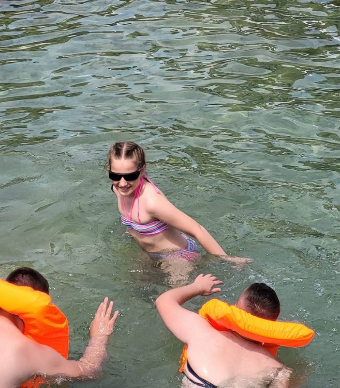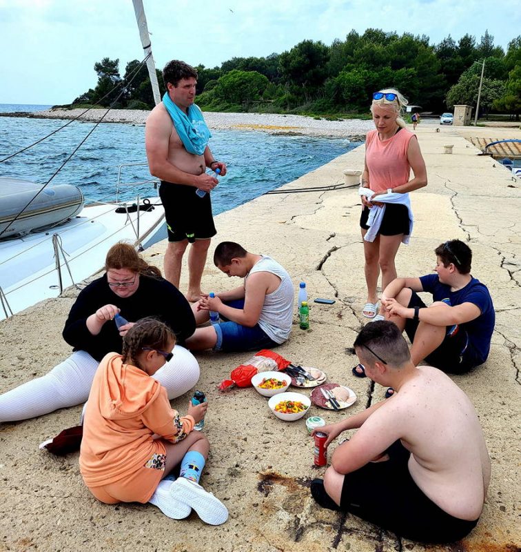 Eni prej drugi kasneje, a do šestih smo bili vsi privezani na bojah zaliva Sv. Andrije, največjega otoka v rovinjskem arhipelagu. Z nasipom je povezan z otočkom Maškin, kjer je veliko čudovitih plaž. Miren zaliv je idealnen za morske radosti, kar otrokom ni bilo potrebno posebej razlagati.