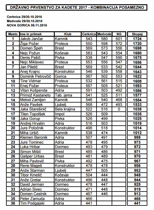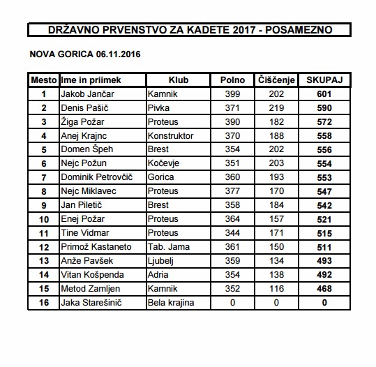 V nedeljo, 5.11.2016 je na kegljišču v Novi Gorici potekalo finale državnega prvenstva za kadete in kadetinje do 18 leta. Veliki finale kadetskega državnega prvenstva si bo zagotovo v najlepšem spominu ohranil Jakob Jančar, mladi talent slovenskega kegljanja, ki je tokrat nadgradil vse svoje dosedanje kegljaške uspehe in osvojil naslov državnega kadetskega prvaka v posamični konkurenci in kombinaciji, kjer so poleg finalnega štela še oba kvalifikacijska nastopa.