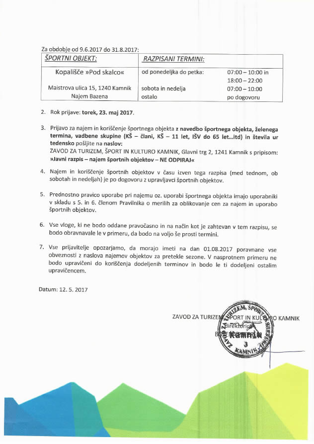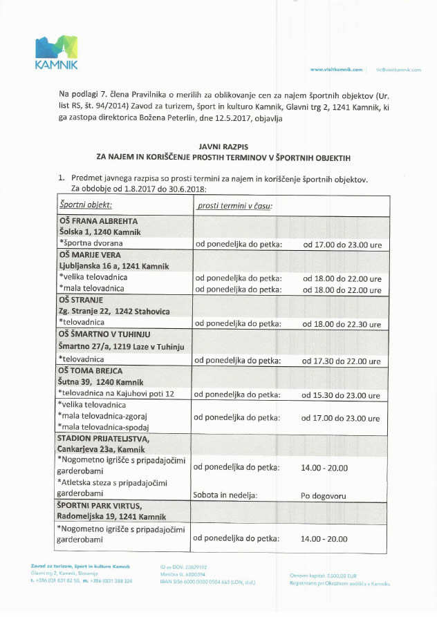 Predmet javnega razpisa so prosti termini za najem in koriščenje športnih objektov Občine Kamnik za obdobje od 1. avgusta 2017, do 30. junija 2018.