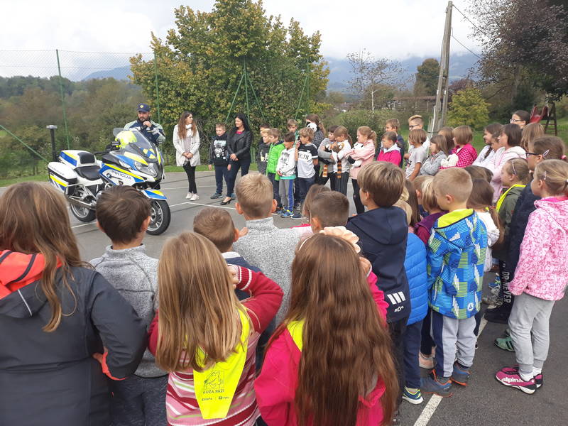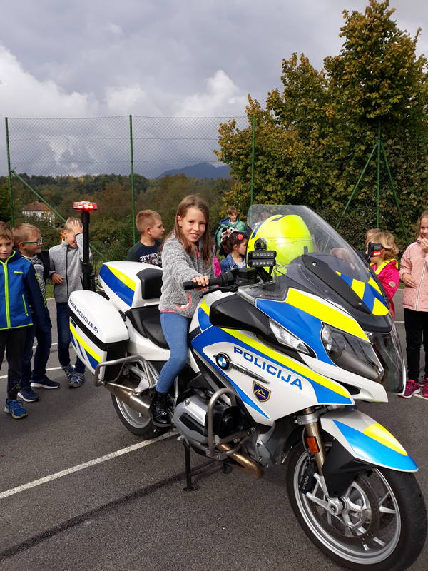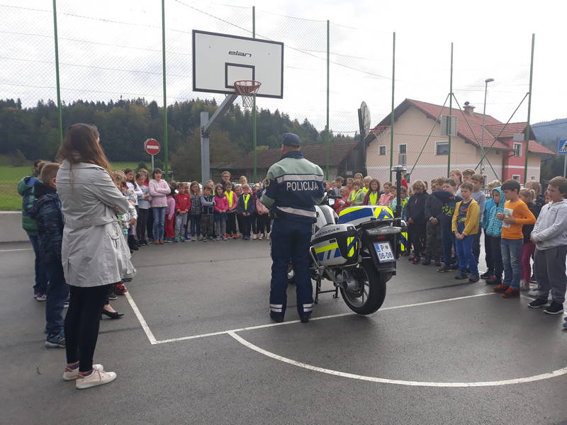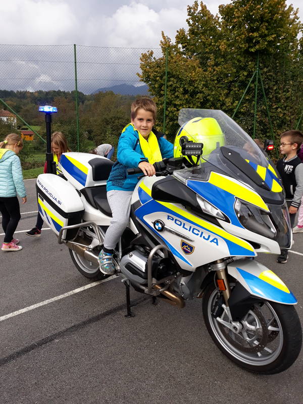 V torek nas je obiskal policist Sandi Sheikha iz ljubljanske enote (na motorju). Predstavil nam je svoj poklic, ponovili smo pravila vedenja na cesti. Spomnil nas je, da smo pozorni pri pripenjanju z varnostnim pasom ter nas naučil pravilnega pripenjanja kolesarske čelade. Vse učence je pozval, naj postanejo njegovi tihi sodelavci in naj svoje starše spomnijo, naj med vožnjo v avtu ne telefonirajo.