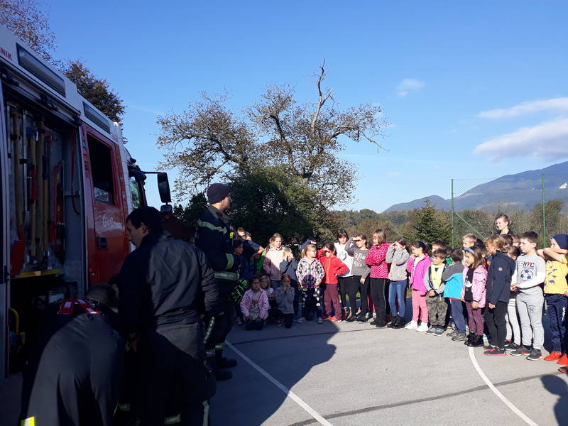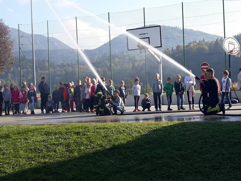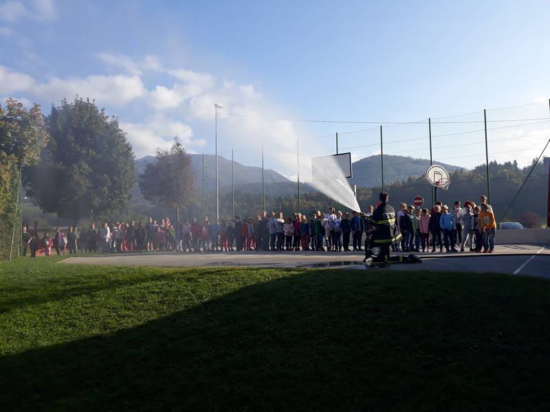 V četrtek smo imeli evakuacijsko vajo. Najprej smo se pogovorili o namenu in pomembnosti vaje, nato smo vajo, s pomočjo gasilcev PGD Kamnik, tudi izvedli. Po končani vaji so nam gasilci predstavili svoje delo, lahko pa smo tudi poskusili škropiti z gasilsko cevjo.