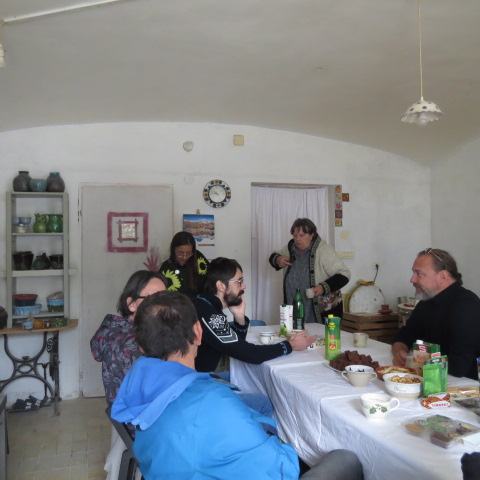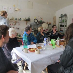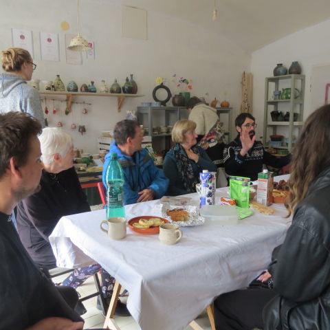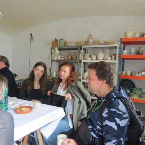 Za mizo, bogato in mamljivo obloženo z doma spečenimi dobrotami, pred vrati, na stolih, umetelni klopci pred ateljejem…so se gnetle knjige. Prave, pravcate knjige.