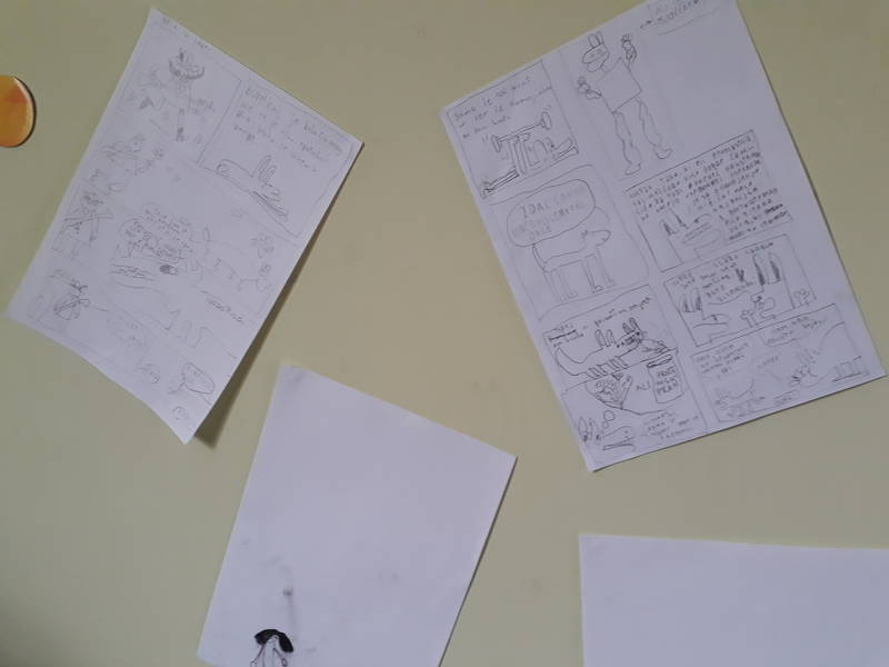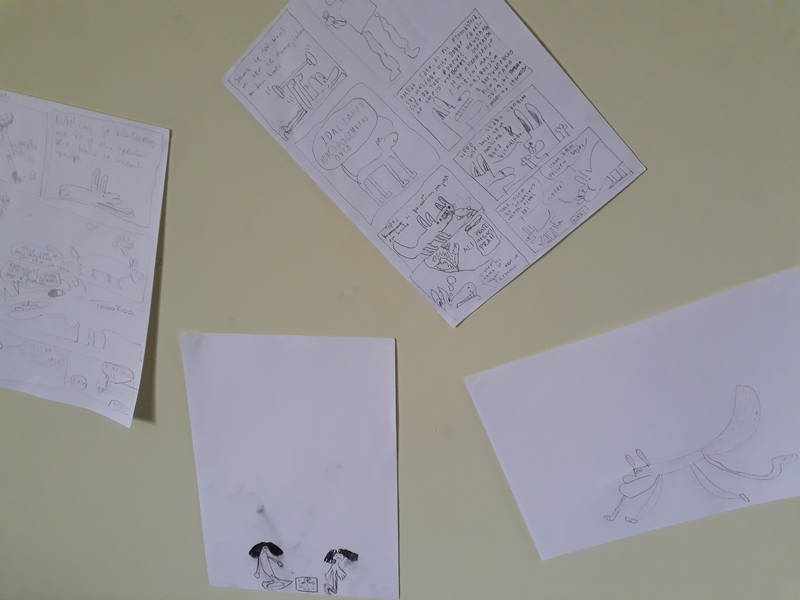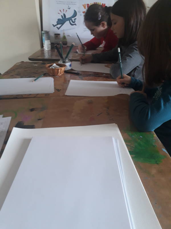 Točni kot ura smo začeli ob desetih. Zbrala se je gručica nadobudnih risarjev in predvsem risark, lahko bi jim rekli kar striparjev in stripark, saj se je dopoldan odvijal v duhu iskanja pravih podob, ki bi z duhovitimi sličicami in besedili v oblačkih (vas to na kaj spominja?) napolnile papirnate pole. Ivan Mitrevski, ilustrator in pravkaršnji dobitnik Zlate hruške, nam je predstavi Volkuljo Belo. Ta je potem zaplesala v podobah domišljije…in se izlila na papir. Strmi, pozorni pogledi, smeh in opazke ter pozorno sklanjanje nad mizami so dali opazovalcu občutek, da se dogaja nekaj res pomembnega. Nastali so pravi, pravcati in čisto zaresni stripi!