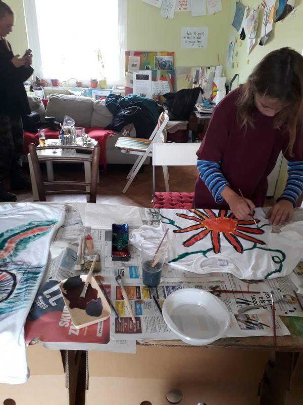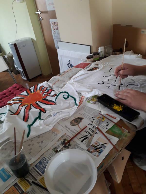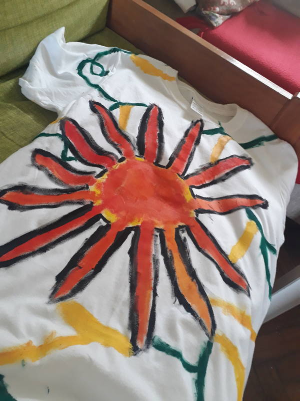 Po skoraj dveh urah, ko smo si končno (zasluženo) oddahnili, se naužili vode, pojedli banano in pošteno zagrizli v kreker, smo se okrepčani lotili drugega podviga. Poslikave majic. Ker nam je iz preteklih delavnic zmanjkalo že nošenih, smo se tokrat, izjemoma, lotili porisavanja lepih belih. Čistina, belina je bodla v oči, zato so majice dobile novo podobo. Črna se je zarisala na beli, nekje je nastal gozd, posijalo je sonce, stekla je reka… Svet je postal pisan.