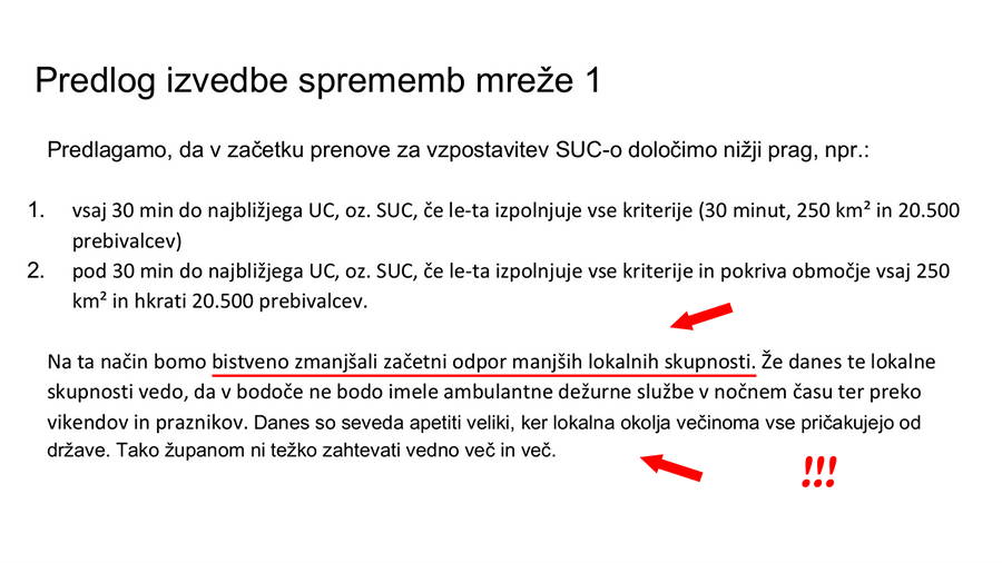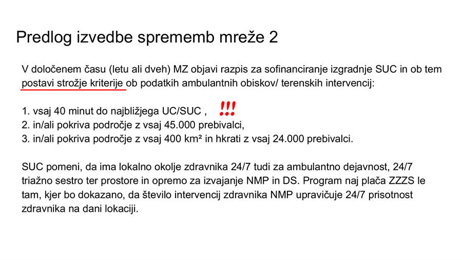 Da gre v resnici zgolj za začasno slepilo oz. taktiko “počasnega kuhanja žabe”, se izkaže že takoj v nadaljevanju predstavitve, v kateri je zapisano: »V določenem času (letu ali dveh) MZ objavi razpis za sofinanciranje izgradnje SUC in ob tem postavi strožje kriterije ob podatkih ambulantnih obiskov/ terenskih intervencij: 1. vsaj 40 minut do najbližjega UC/SUC , 2. in/ali pokriva področje z vsaj 45.000 prebivalci, 3. in/ali pokriva področje z vsaj 400 km² in hkrati z vsaj 24.000 prebivalci.”