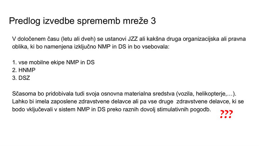 Okuženi z nezaslišanim cinizmom delovne skupine MZ, od katere bi pričakovali, da si bo prizadevala kvečjemu za izboljševanje sistema in ne obratno, bi lahko zapisali, da bodo morali urgentni zdravniki delati na normo, občani krajev, ki bodo želeli stalno prisotnost urgentnega zdravnika v svoji bližini, pa bodo morali, z dovolj rednimi nezgodami, nesrečami in zadostnim številom nujnih medicinskimi stanj, plačevati krvavi samoprispevek. Obenem pa se ob prebiranju delovnega gradiva nehote pojavlja še en precej nelagodno zoprn občutek, da se z reorganizacijo in “osamosvajanjem” NMP na nek način pravzaprav poskuša pripraviti teren tudi za morebitno “privatizacijo” oz. “komercializacijo” nujne medicinske pomoči.