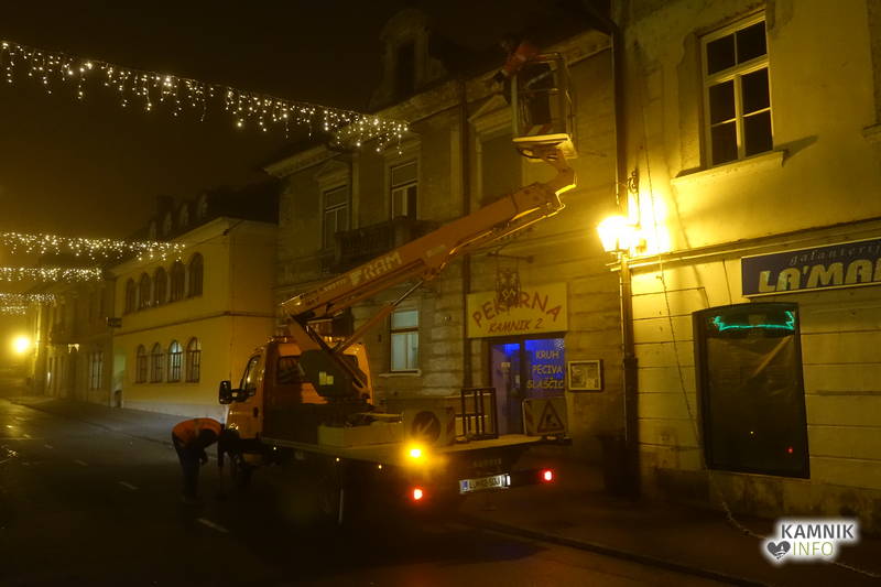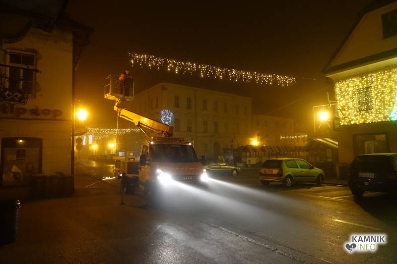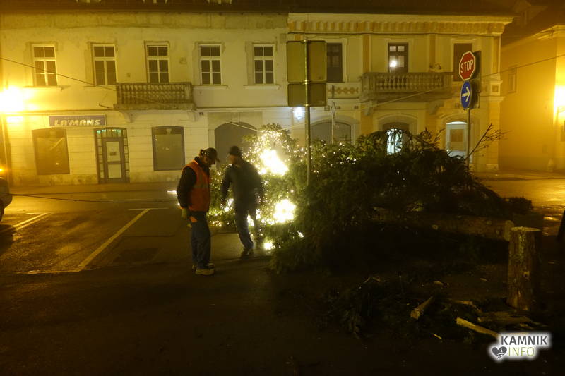 Delavcem Komunalnega podjetja Kamnik je požagano in podrto novoletno jelko na Glavnem trgu, po celonočnem delu, uspelo postaviti nazaj.