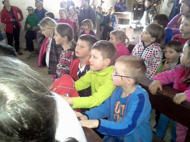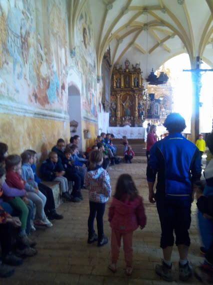 S pripovedovalko in snovalko poti Ireno Cerar smo si skupaj ogledali obe znameniti gotski cerkvi. Z zanimanjem smo si ogledali freske, prisluhnili zgodbi o svetih treh kraljih, ki so se z darovi napotili k Jezusu, in se posvetili zanimivim likom in živalim na freskah, kot je na primer okroglolični kuhar s košaro jajc, ali pa kamele z nenavadnimi parklji, prešteli konje in celo debatirali o tem, ali je ptič na lovčevi roki sokol ali le golob. Na toplem pomladnem soncu smo prisluhnili drobnim zgodbam o Turkih, ki so želeli napasti cerkev, pa so jim čudeži to preprečili, in o lovcih, ki so lovili na praznike in se malo tudi norčevali iz svetega Primoža, za kazen pa so okameneli. Dve različici istega motiva sta povedali Irena Cerar in Breda Podbrežnik.