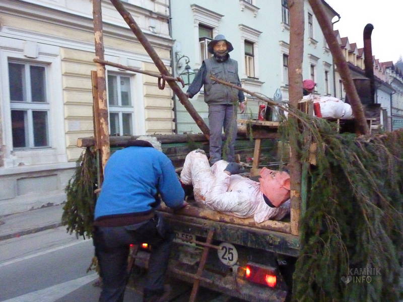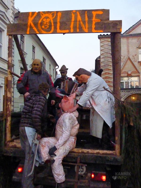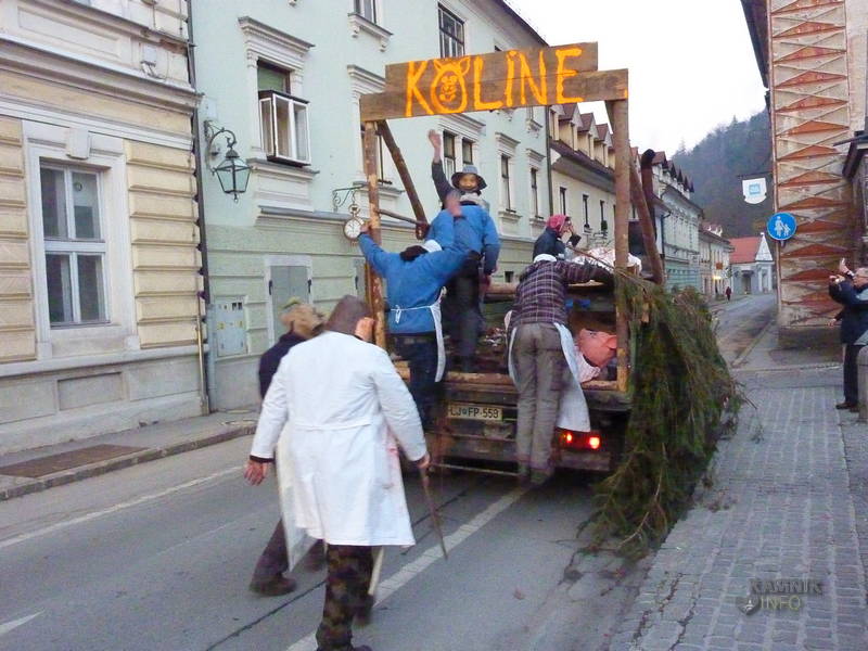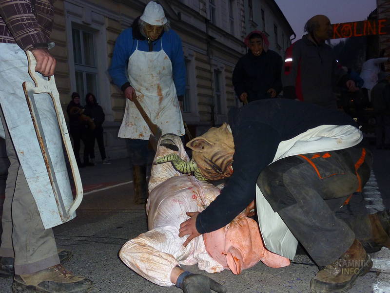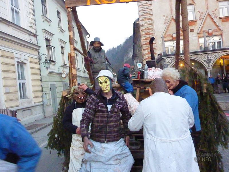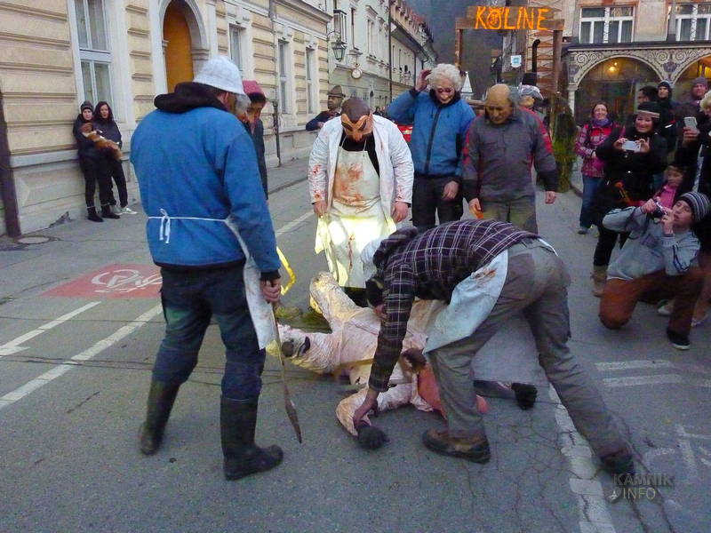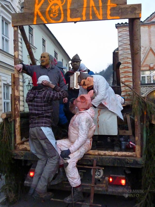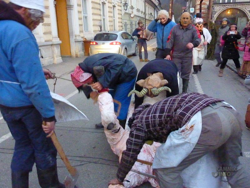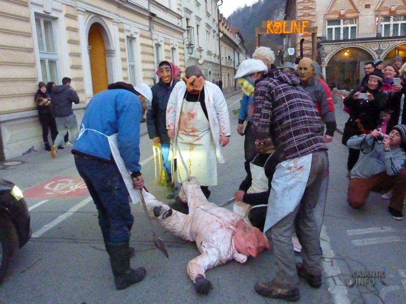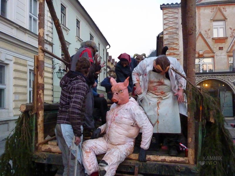 Na Glavni trg so se namreč, v ravno pravem trenutku, pripeljali »Kolinarji iz Stranj«, s pujsi in mesarji, ki so na cesti pred pošto uprizorili pravcati mali spektakel. Z voza jim je namreč ušel prasec, vendar so ga kruti mesarji in pomočniki brž ročno ukrotili in spravili nazaj na voz, kjer ga je čakala preobrazba v “flajšmašini”. No, naj ljubitelje živali potolažimo, da pujsu ni bilo hudega, le jutri utegne biti, tako kot mesarji iz spremstva, deležen “postnega” glavobola.