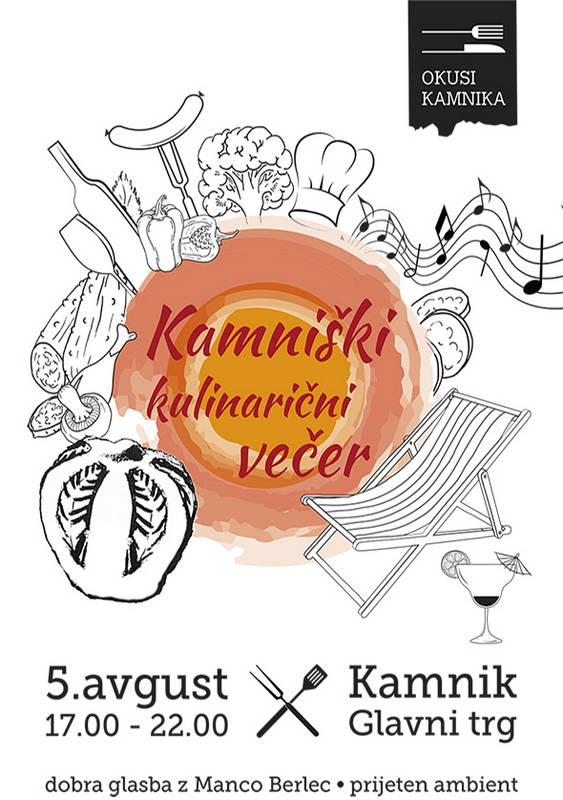 Dneve trniča, ki se v Kamniku odvijajo vsako leto v začetku avgusta, bomo letos nadgradili z vikendom tradicionalnih lokalnih jedi Okusi Kamnika. Začel se bo s petkovim Kamniškim kulinaričnim večerom, ko se bo od 17. ure dalje Glavni trg spremenil v udobno dnevno sobo z ležalniki, mizicami in foteljem. Na stojnicah se bodo z lokalnimi jedmi predstavljali številni kamniški ponudniki, ki bodo cel večer skrbeli, da mestnega jedra nihče ne bo zapustil lačen oziroma žejen. Da bo vzdušje res pravo, bosta s poletno glasbo poskrbela kamniška glasbenika Manca Berlec in Matej Zore. Čaka pa vas tudi sladko presenečenje, saj bomo na ta večer razkrili nov produkt Okusov Kamnika – čokoladi s trničem. in rušovcem. Vabljeni, da se udobno namestite v kamniško dnevno sobo in v mestnem jedru preživite okusen večer. Več informacij o dogodku lahko najdete na Facebook strani Kamniški kulinarični vikend, 5.-7. avgust.