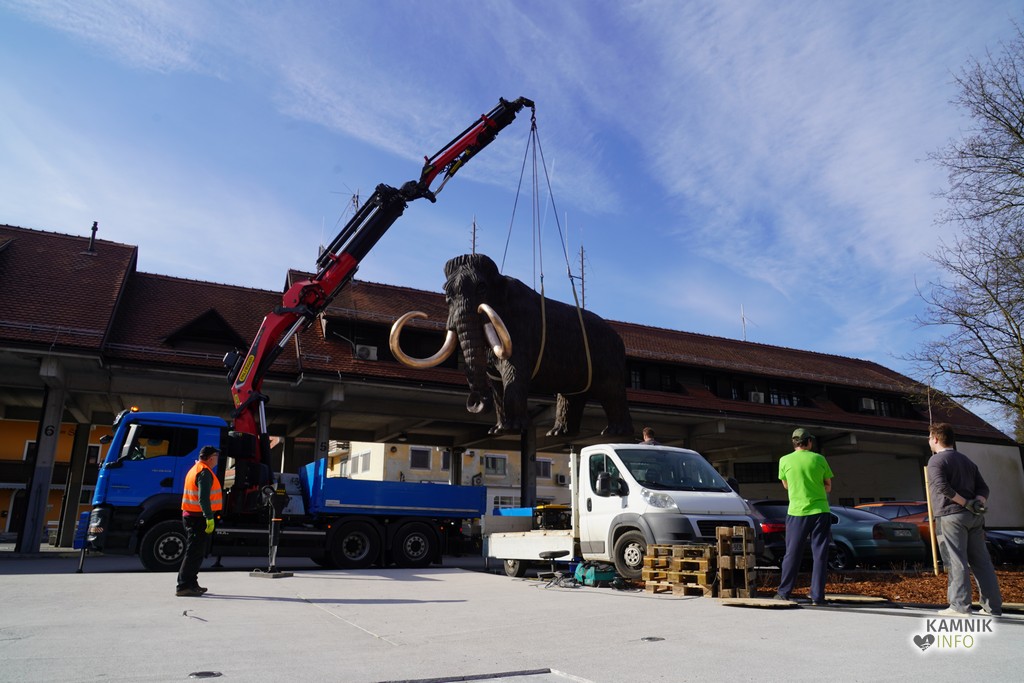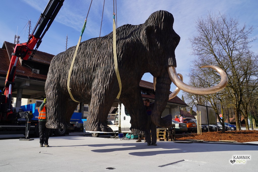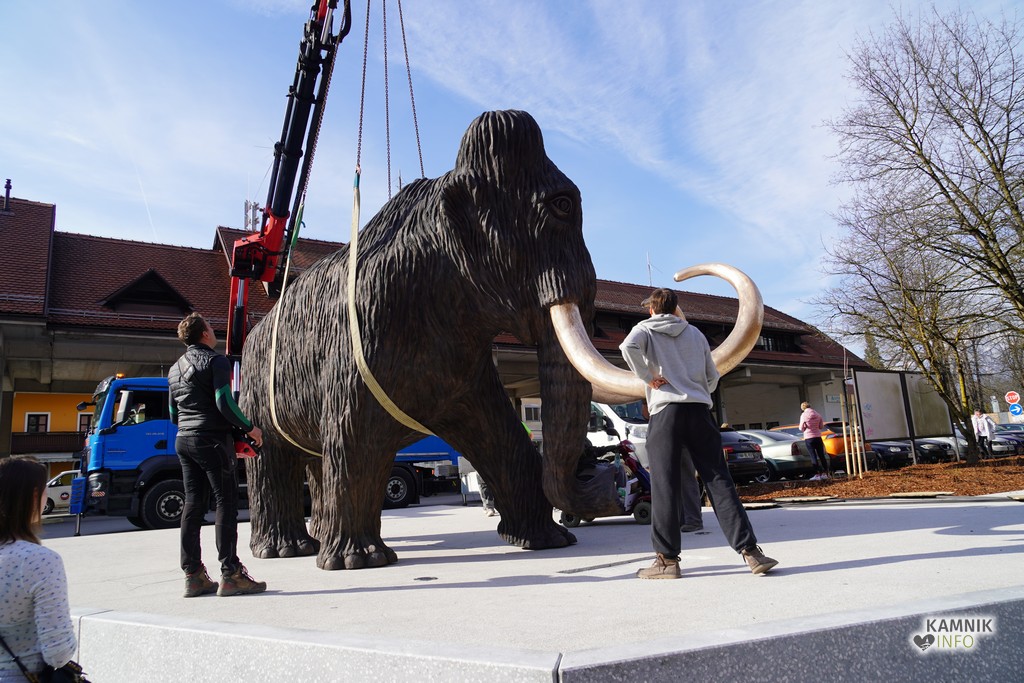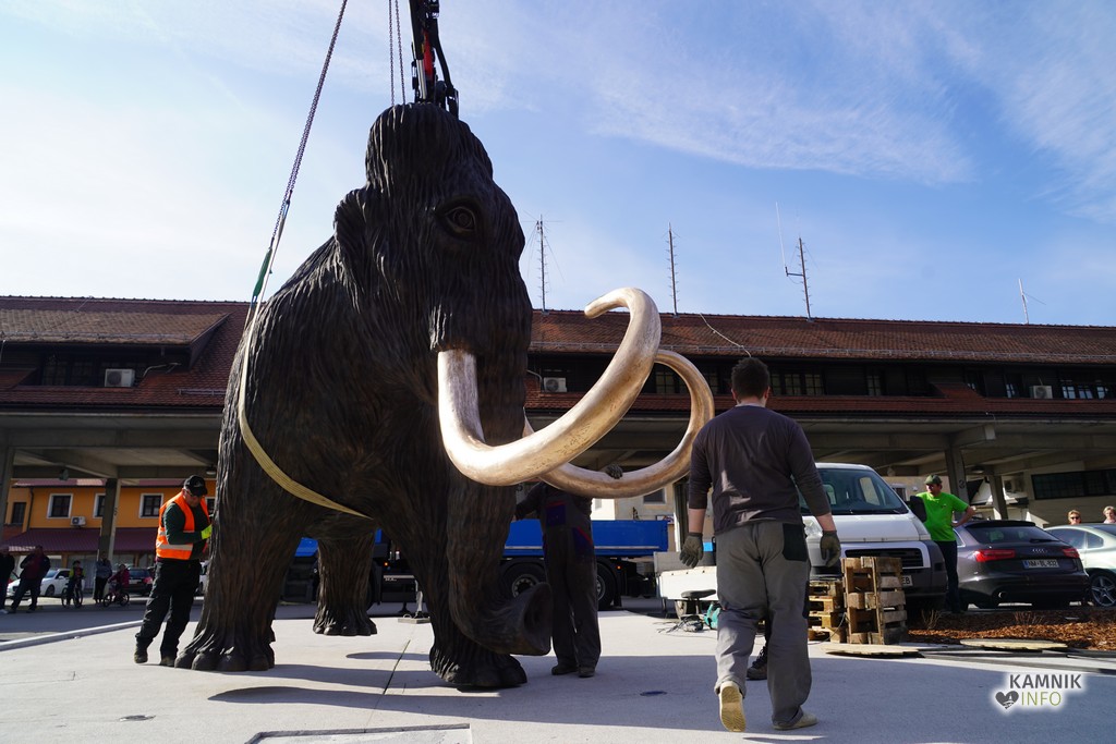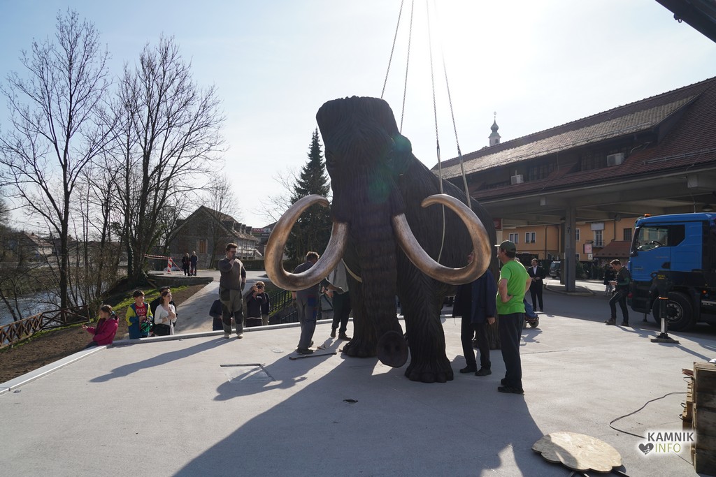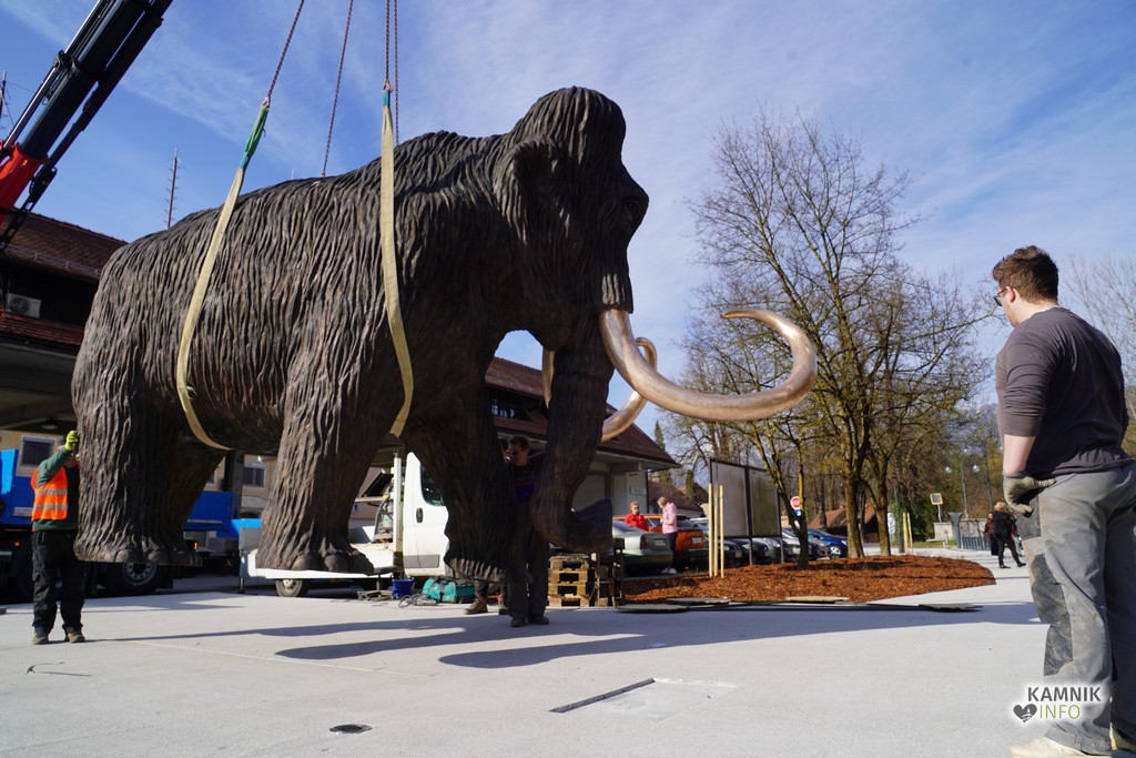 Na ploščadi med reko Kamniško Bistrico in kamniško avtobusno postajo so danes popoldne postavili bronasto skulpturo mamuta, ki jo je že leta 2008 izdelal kamniški kipar Miha Kač.