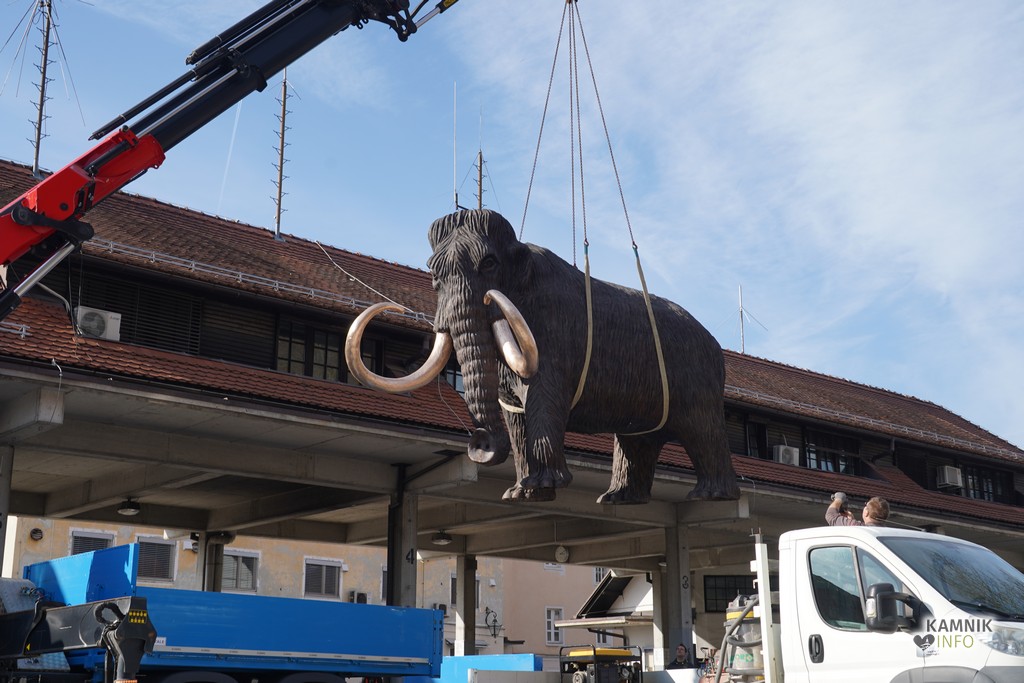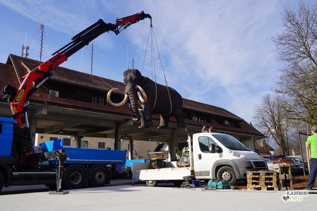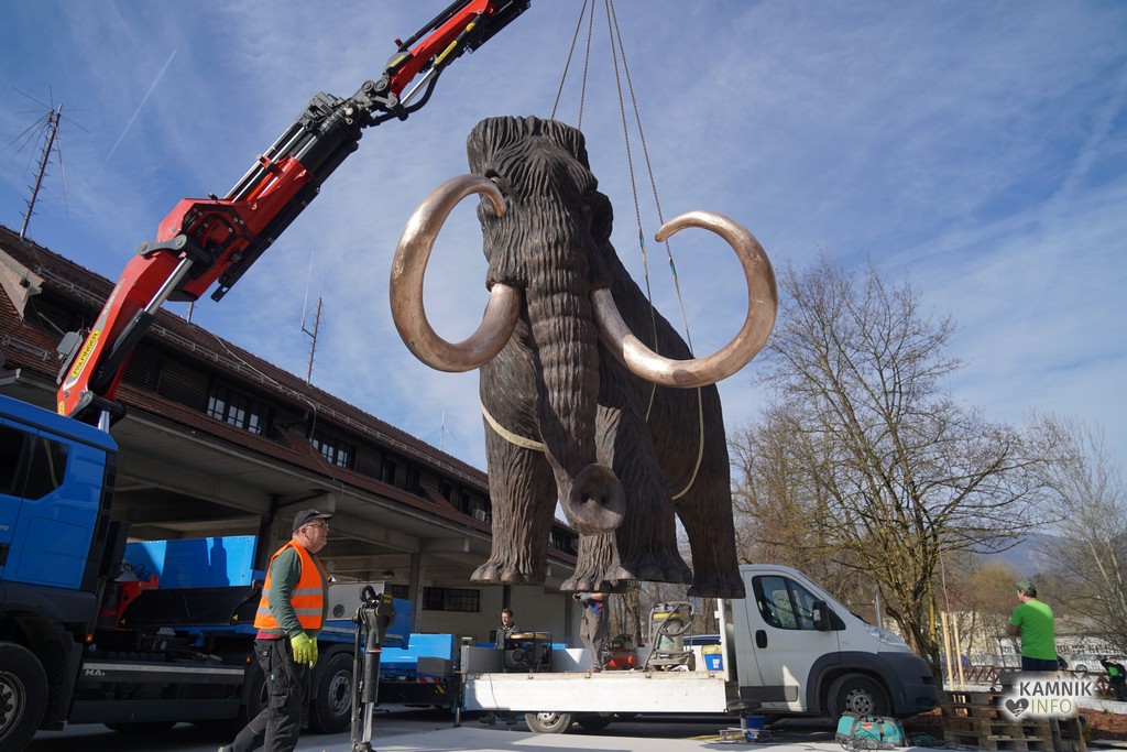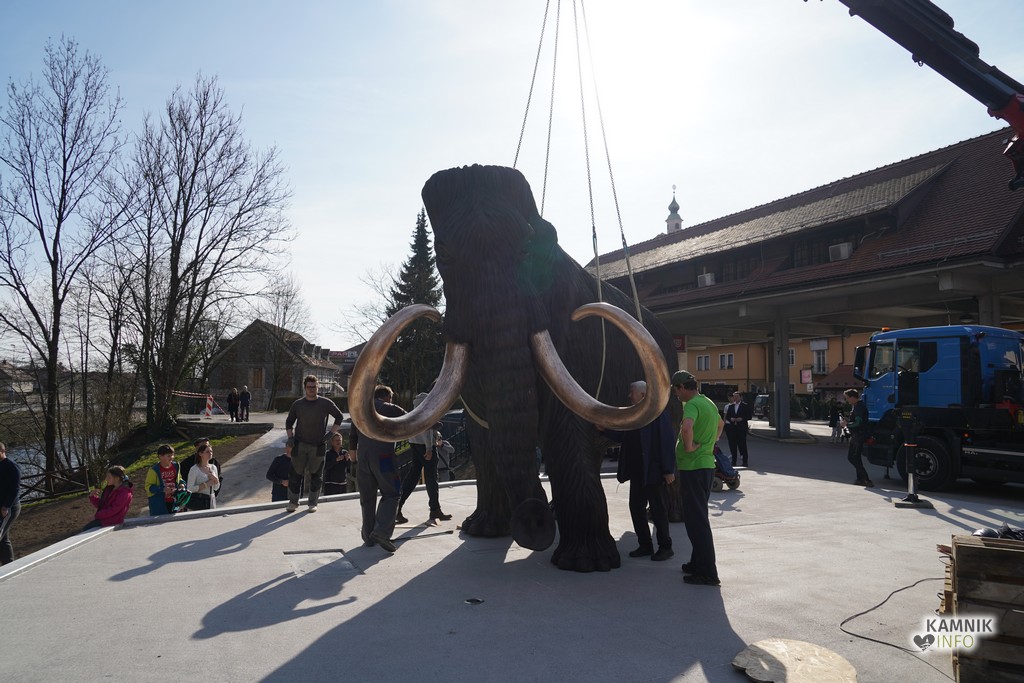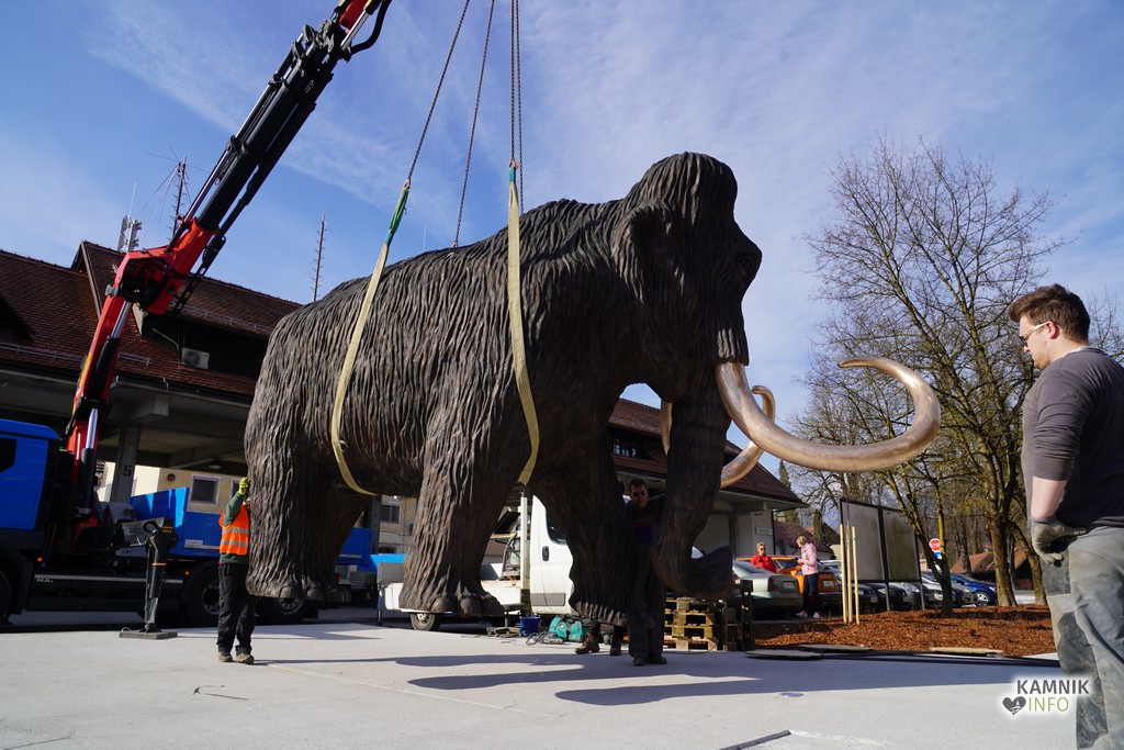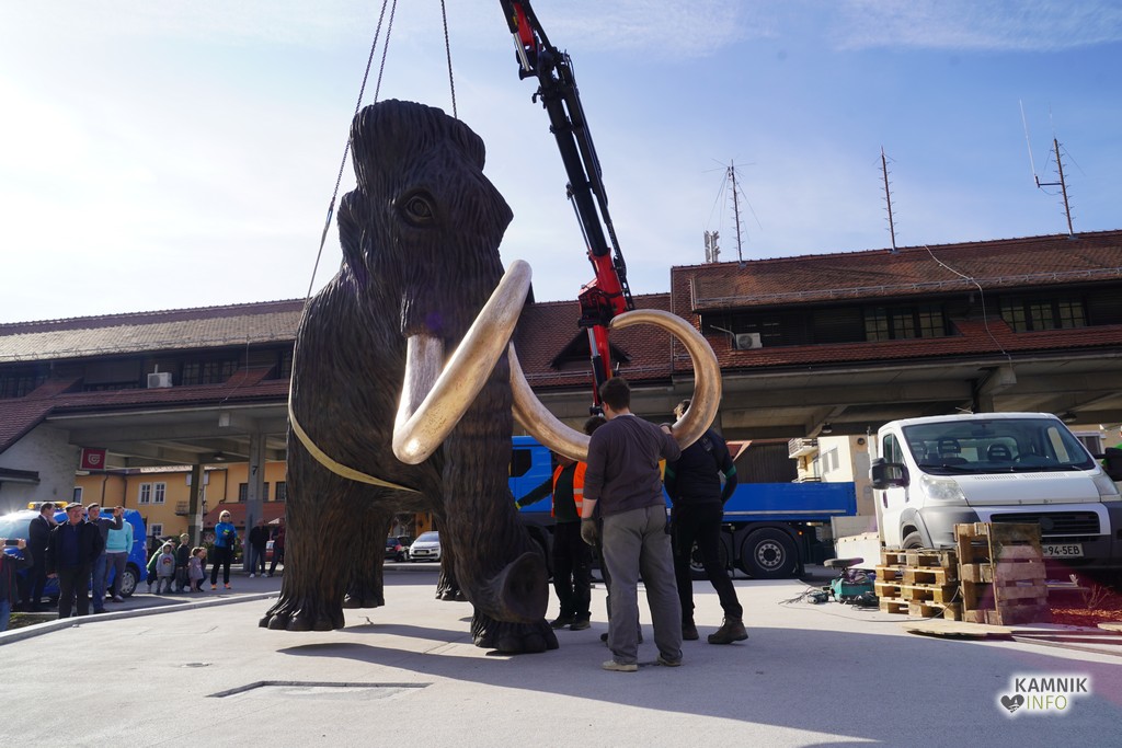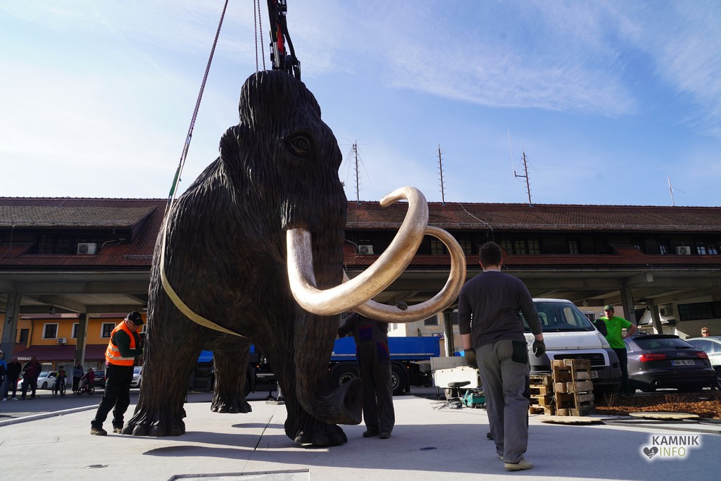 Na ploščadi med reko Kamniško Bistrico in kamniško avtobusno postajo so danes popoldne postavili bronasto skulpturo mamuta, ki jo je že leta 2008 izdelal kamniški kipar Miha Kač.