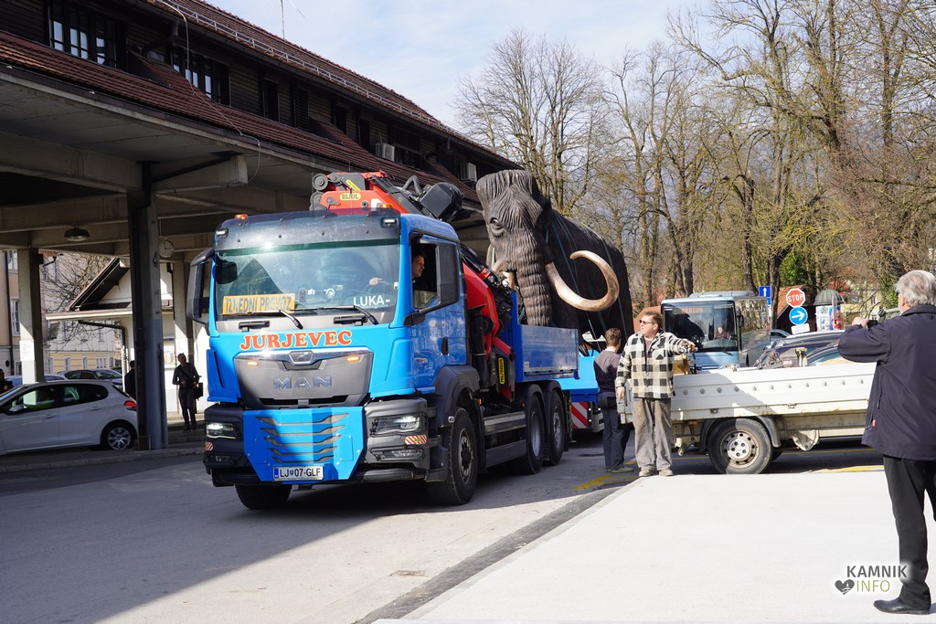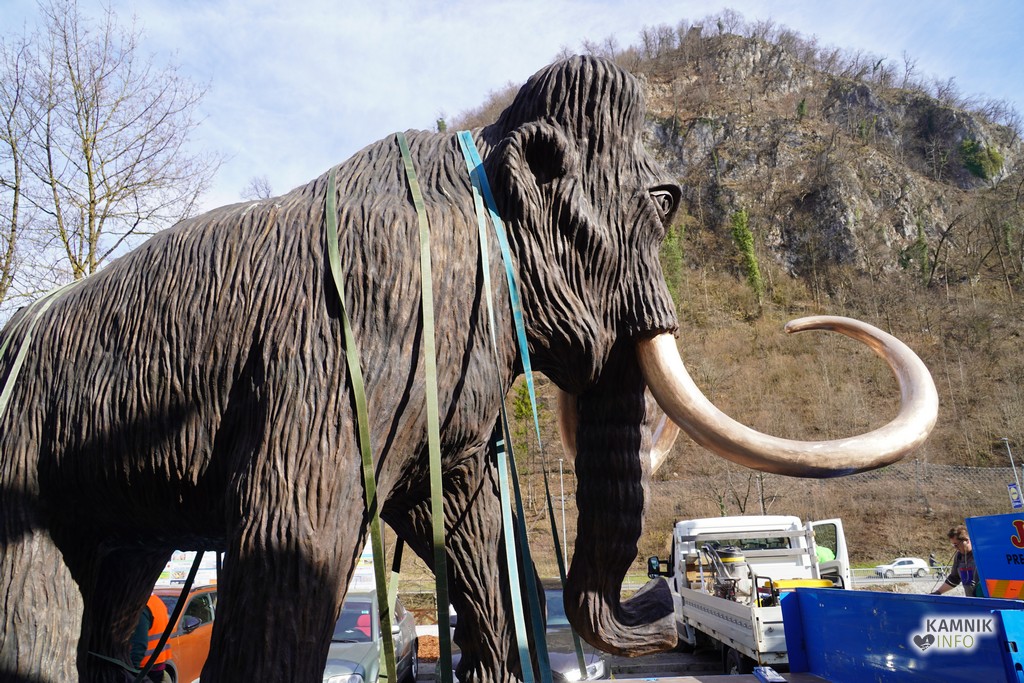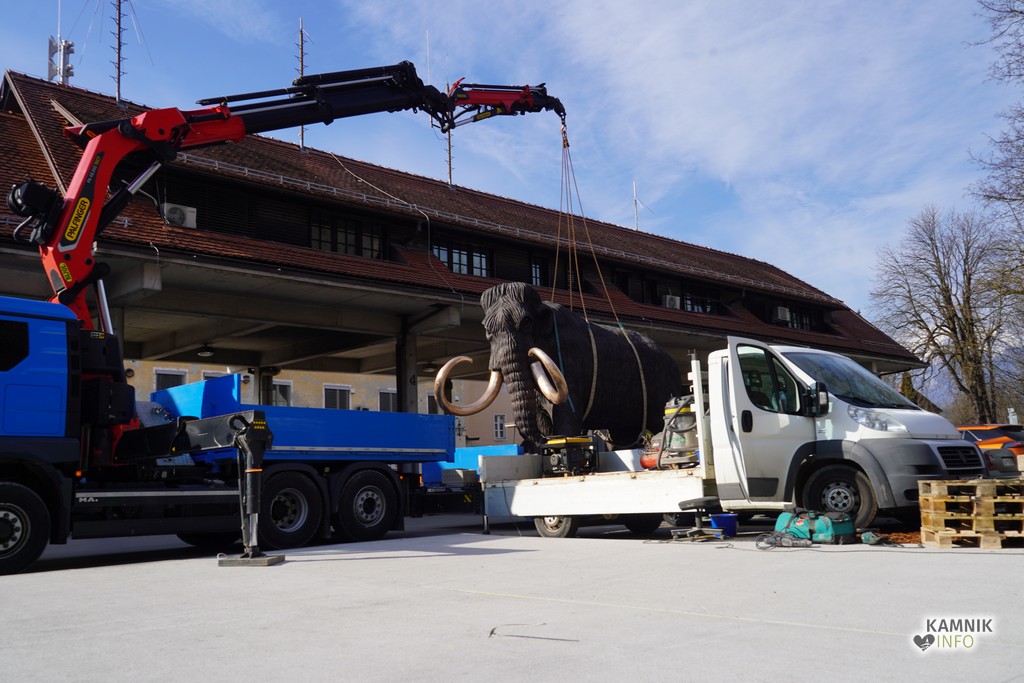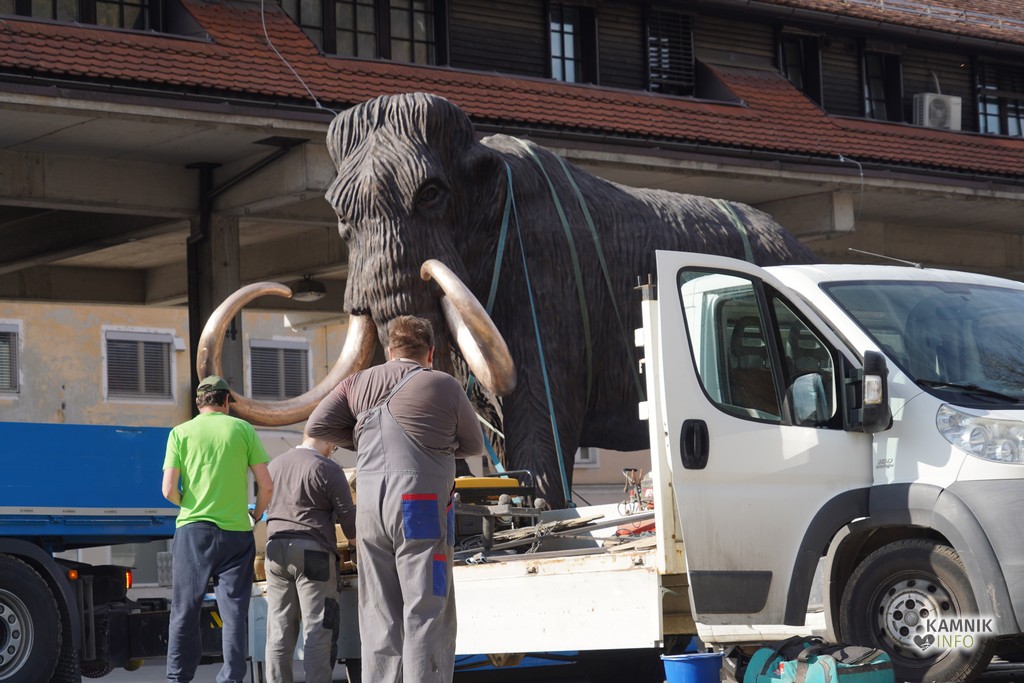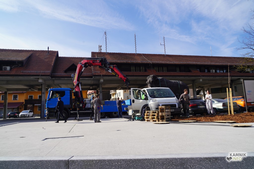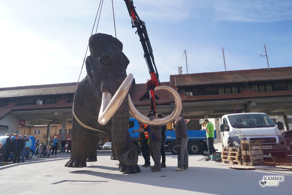 Na ploščadi med reko Kamniško Bistrico in kamniško avtobusno postajo so danes popoldne postavili bronasto skulpturo mamuta, ki jo je že leta 2008 izdelal kamniški kipar Miha Kač.